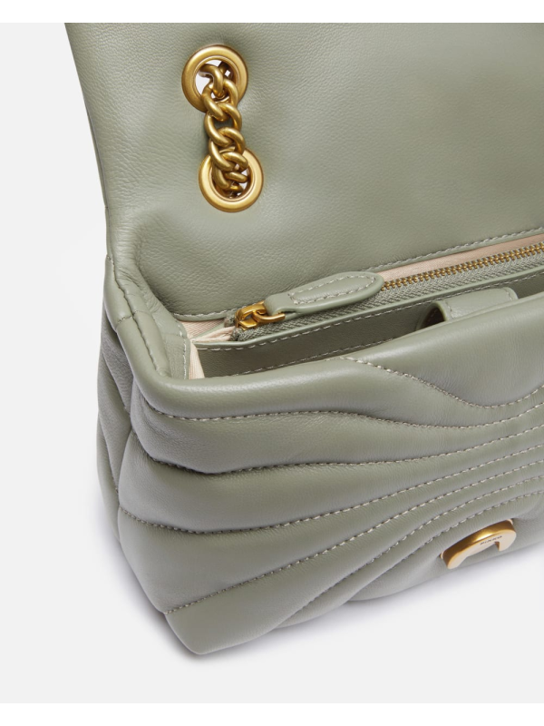 Klizni metalni remen s lančićem s jastučićem za rame od nappa kože može se udvostručiti za nošenje torbe na ramenu. Zatvaranje s preklopom ukrašeno je legendarnom kopčom Love Birds Diamond Cut od galvaniziranog metala od starinskog zlata.