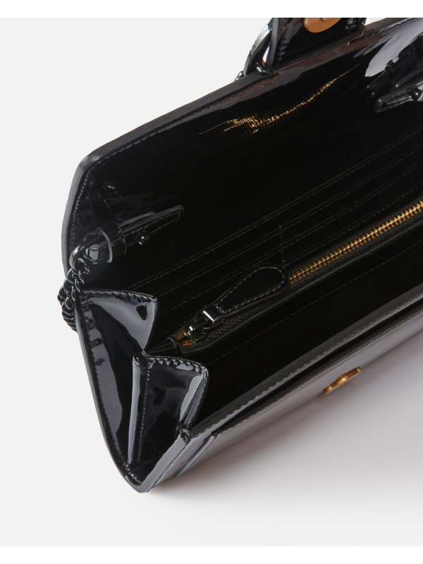 Novčanik, dizajniran kao spojka, također uključuje tanki emajlirani metalni lančić za nošenje preko ramena u odgovarajućoj boji, koji se može skinuti pomoću malih karabinera.