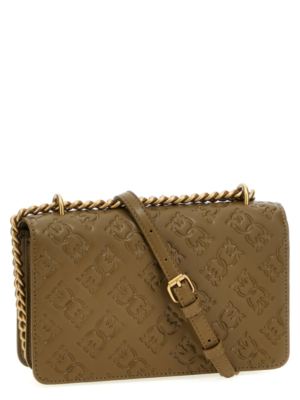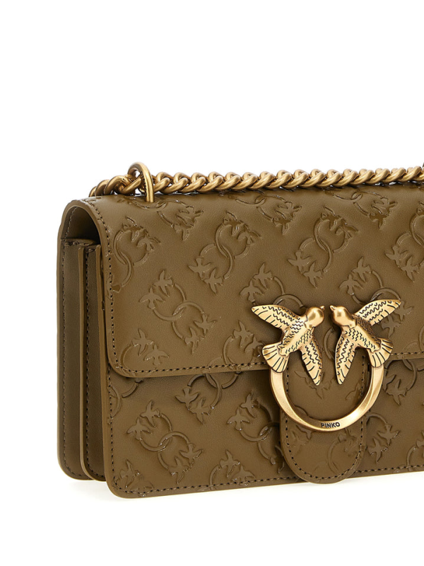 'Mini Love Bag' kožna torba preko ramena s reljefnim uzorkom logotipa po cijeloj površini, magnetnim zatvaračem, metalnim logotipom s prednje strane, lančićem za nošenje preko ramena s kožnom naramenicom.
