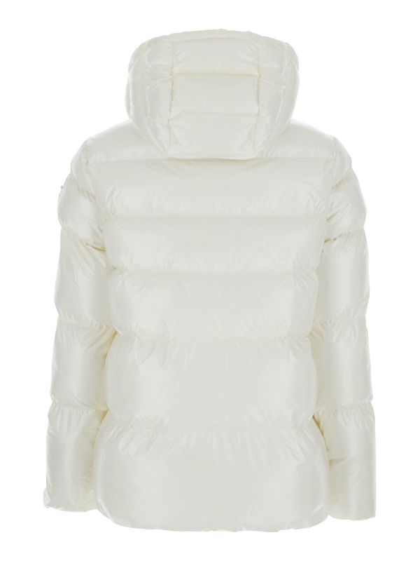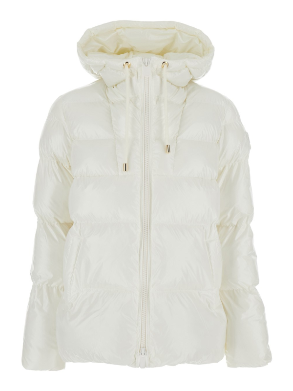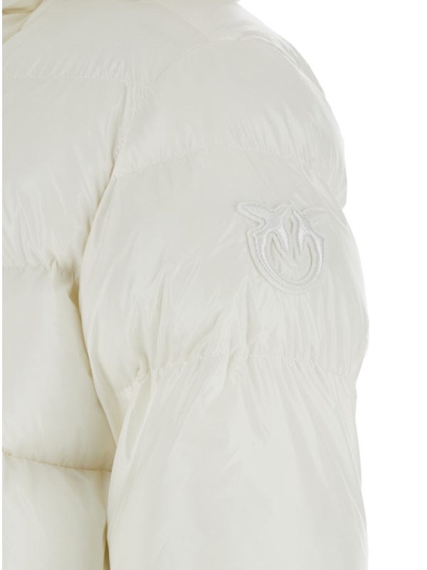 Ženska bijela perjana Pinko jakna s kapuljačom i dijamantim izrezom loga na rukavu