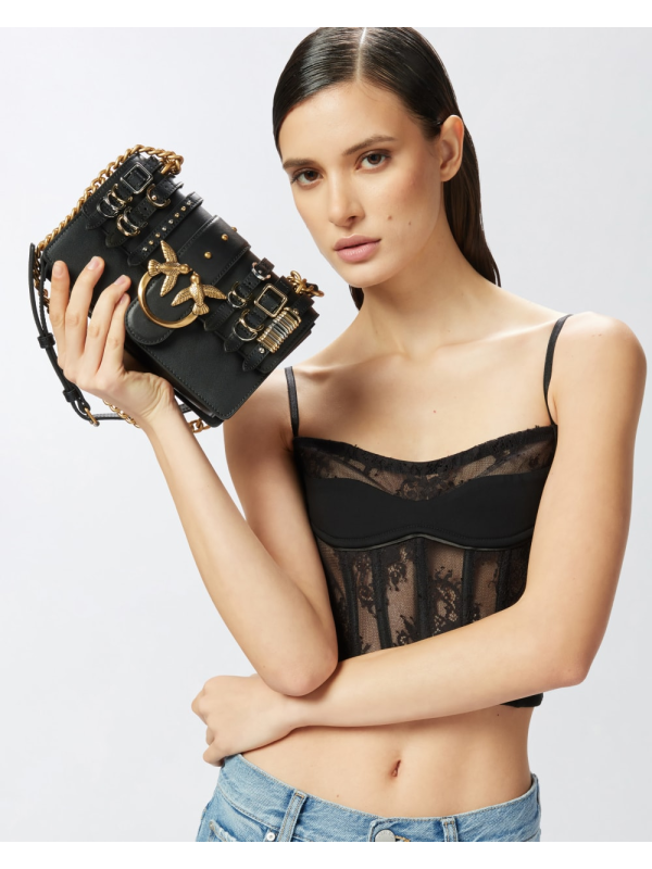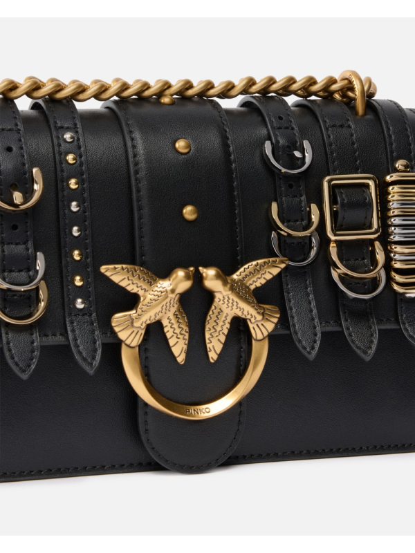 Mini Love Bag Lagana ženska torba za preko ramena laganog, dekonstruiranog dizajna, izrađena od meke, svilenkaste kože s remenima s kopčama i metalnim detaljima na prednjem poklopcu.