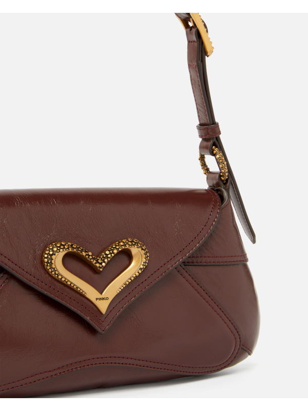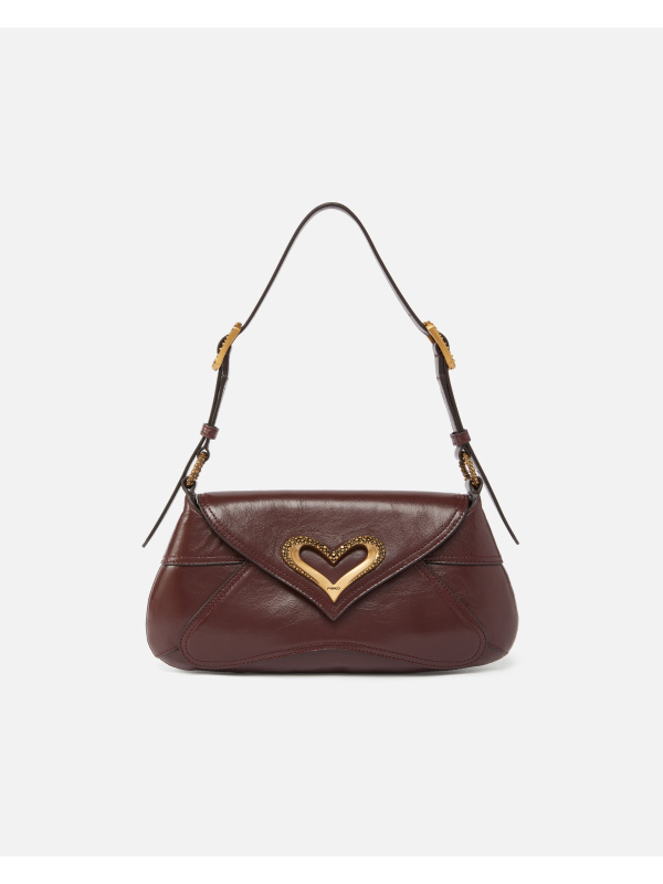 Šiljasti preklop prati nova gravirana metalna kopča u obliku srca s mikro zakovicama. Iznutra torba ima podstavu od tkanine s efektom antilopa i praktični džep s patentnim zatvaračem.