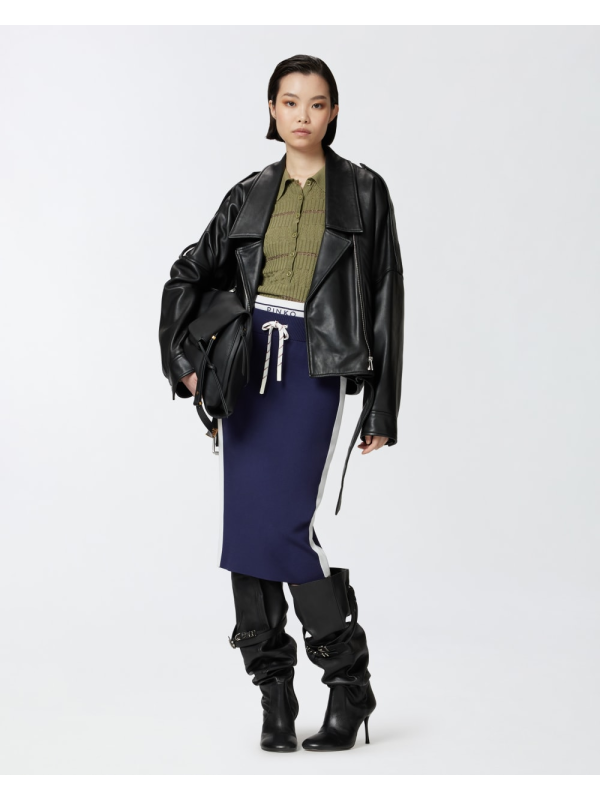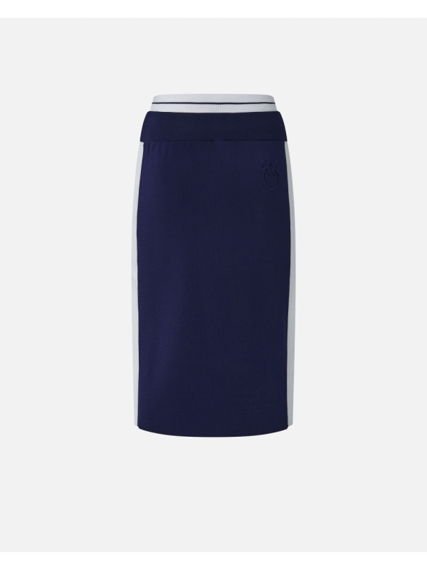 Midi suknja od vrlo mekane tehničke viskozne pike tkanine s efektom poput flisa, ukrašena bočnim trakama bijele kontrastne boje s obje strane.
