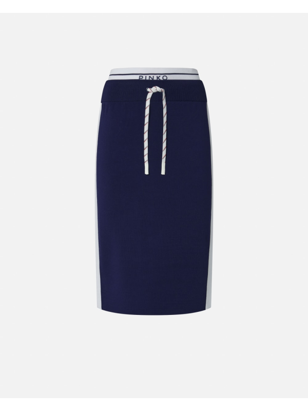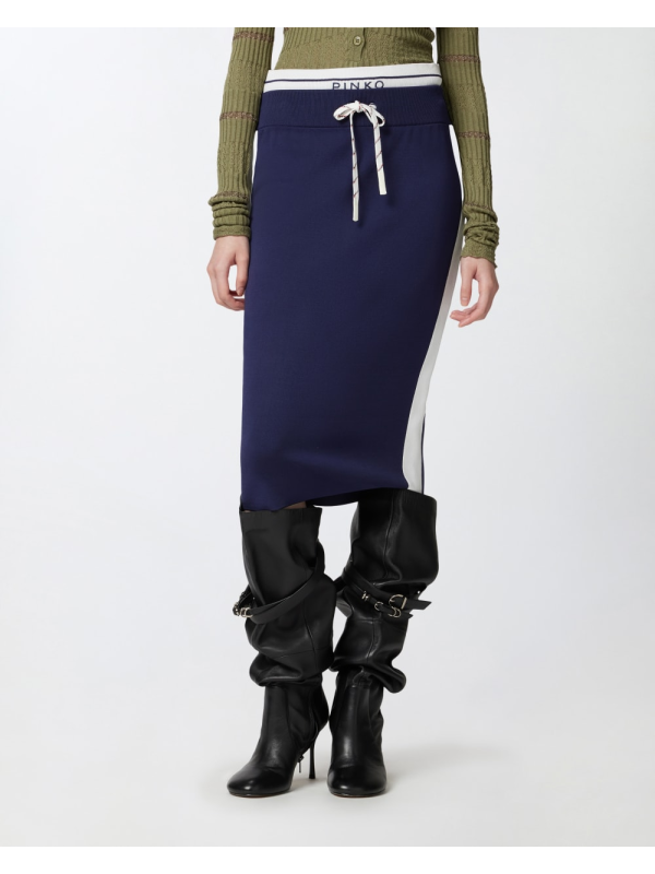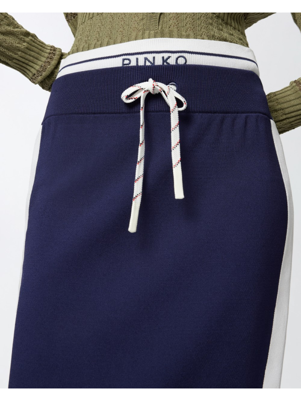 Ova pencil suknja inspirirana sportskom odjećom prilagođena je s elastičnim umetkom u struku—s logotipom PINKO i uzicom—koji izgleda kao par donjeg rublja koji se nosi ispod.