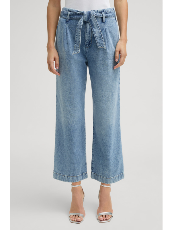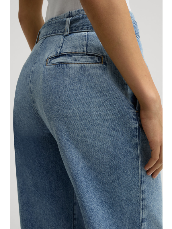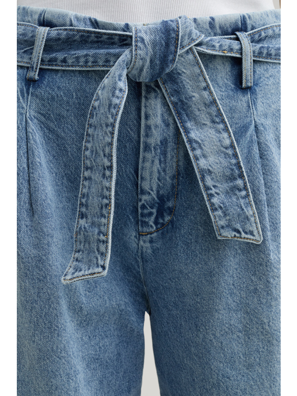 Dizajn širokih nogavica i isprani izgled daju komadu ležernu završnicu, dok remen za vezivanje u tonu dodaje moderan detalj. Nabrani pojas, džepovi s rubom i zastava s logotipom na bočnom šavu stvaraju naglaske.