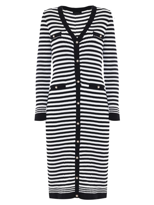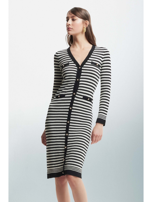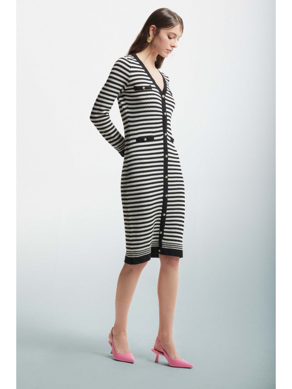 Ova pletena haljina s V-izrezom ima upečatljiv uzorak dvobojnih pruga, završenih gumbima s draguljima za besprijekoran izgled.