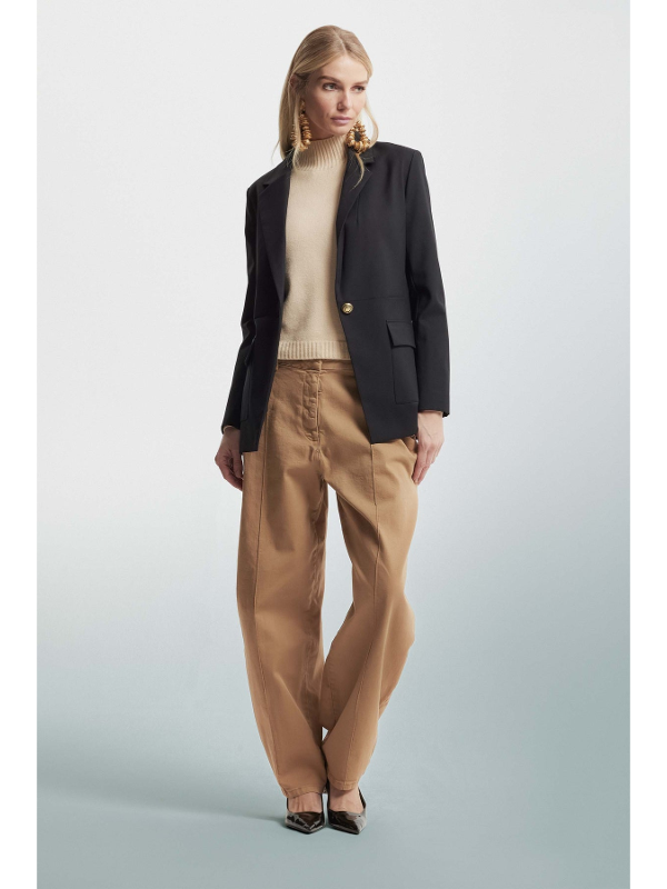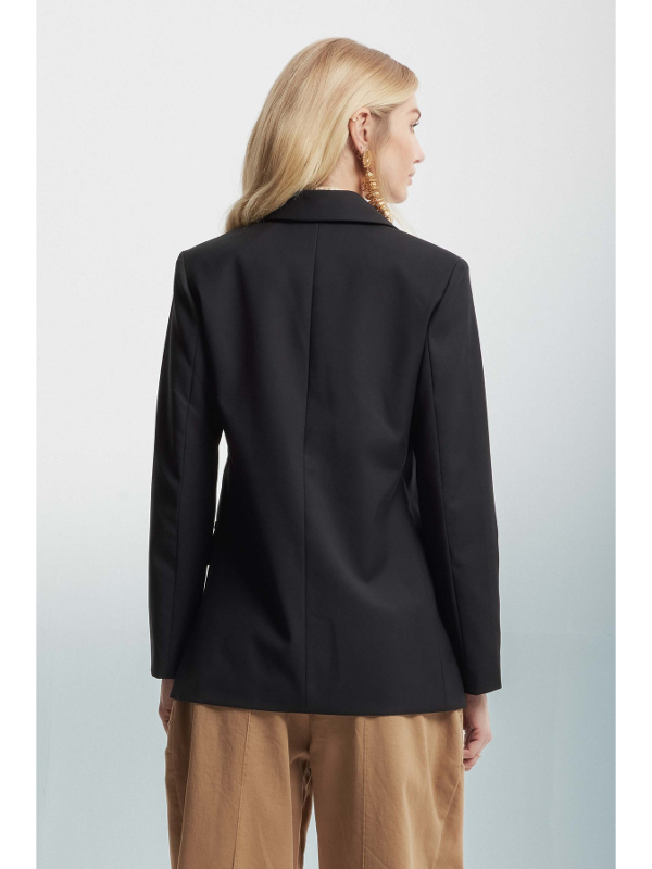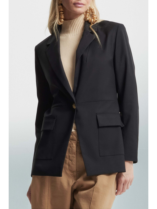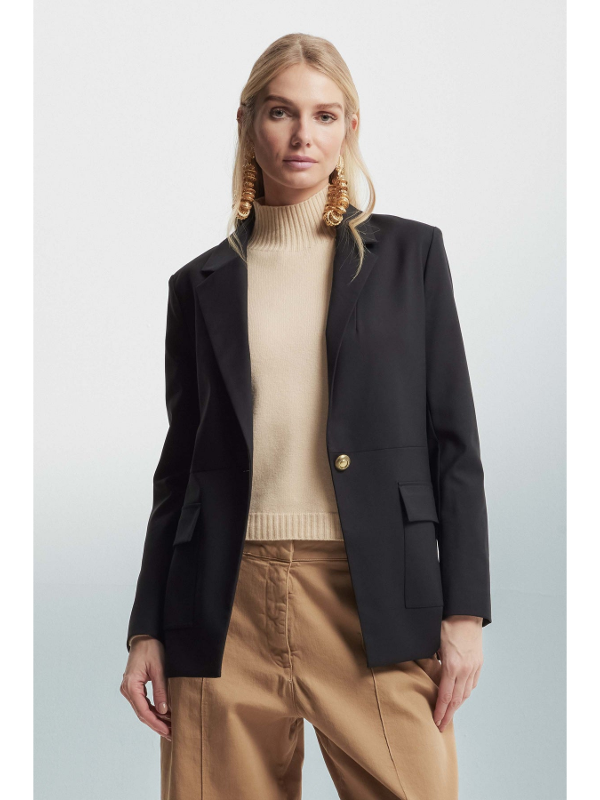 Ovaj ženski sako s jednim kopčanjem izdvaja se svojim elegantnim i profinjenim dizajnom, džepovima s preklopima i kontrastnim gumbima.