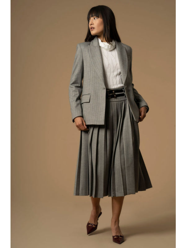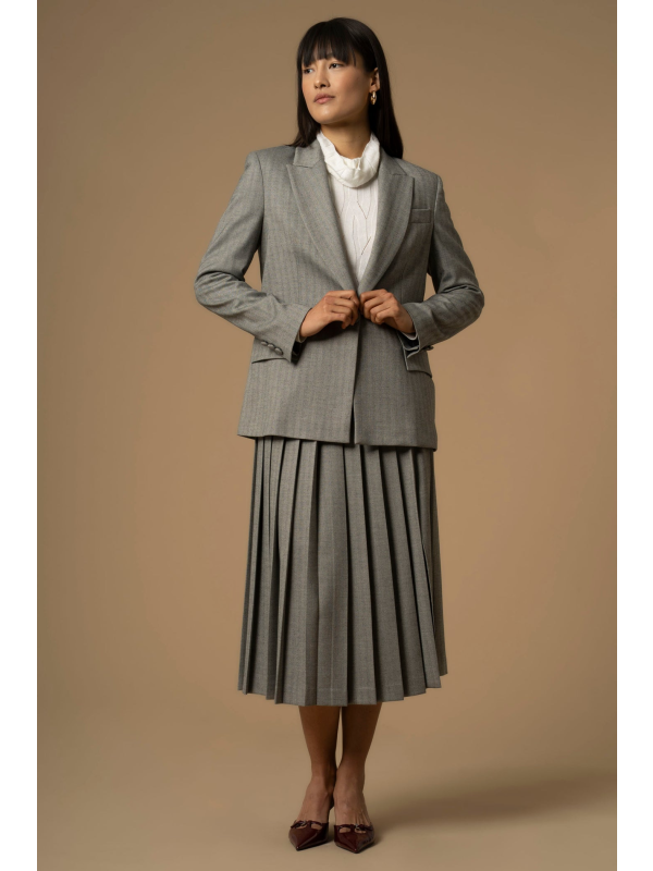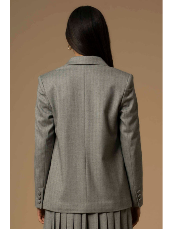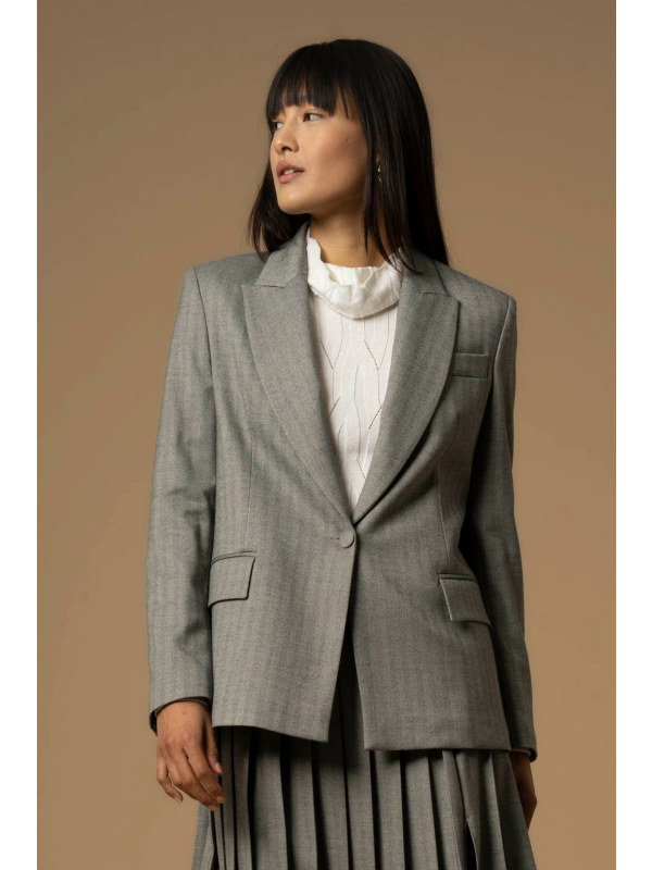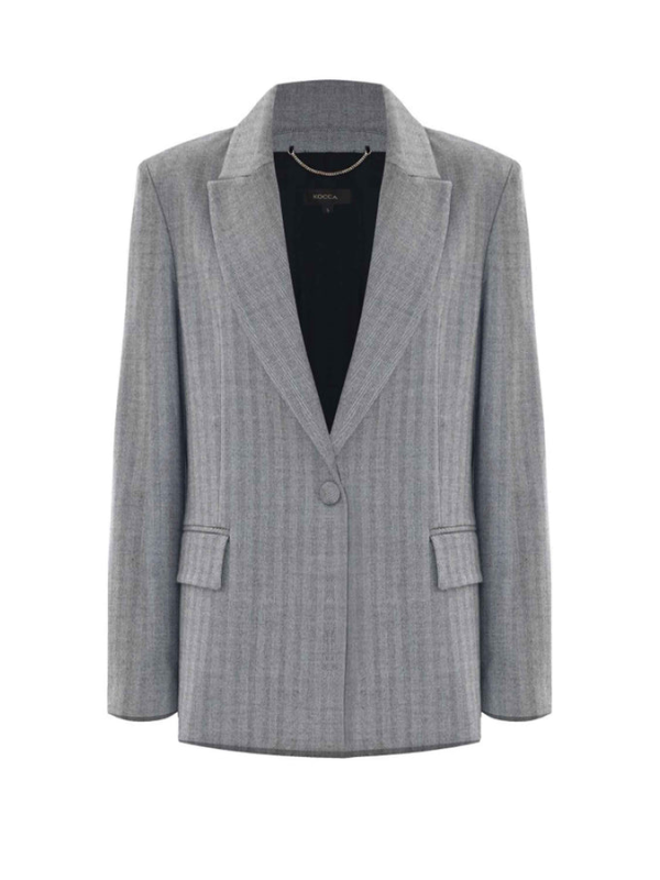 Elegantna jakna dugih rukava, lagano prugasta, u stilu sakoa, standardni reveri, jednobojni gumb, tri diskretna prednja džepa, krojeni rubovi