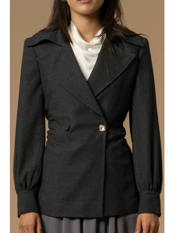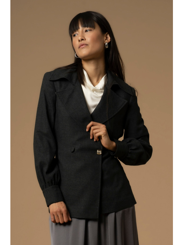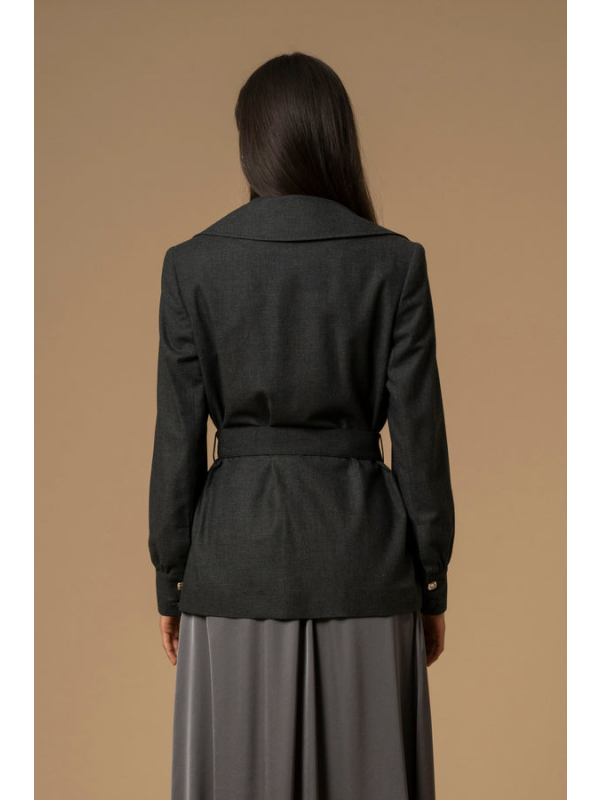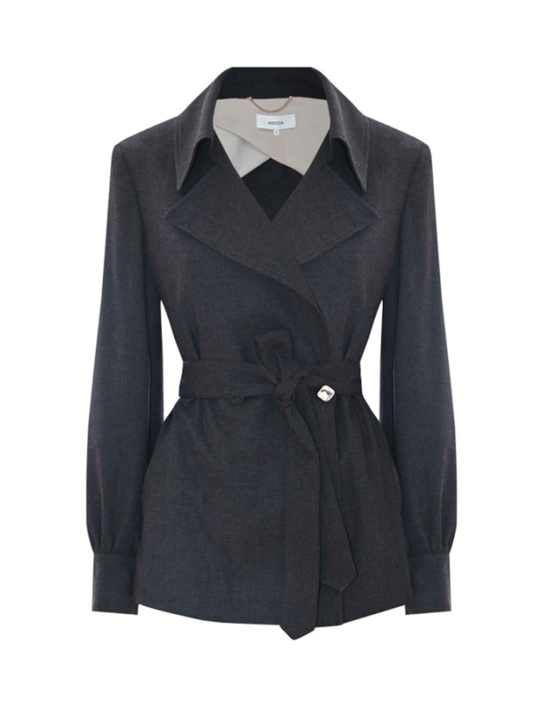 Elegantni sako opuštenog kroja, veliki reveri koji se stapaju s predimenzioniranim ovratnikom, remen oko vrata usklađene boje, iz kolekcije Pure Verve Capsule