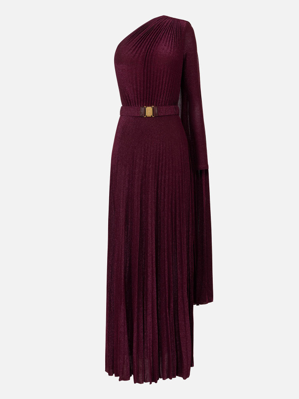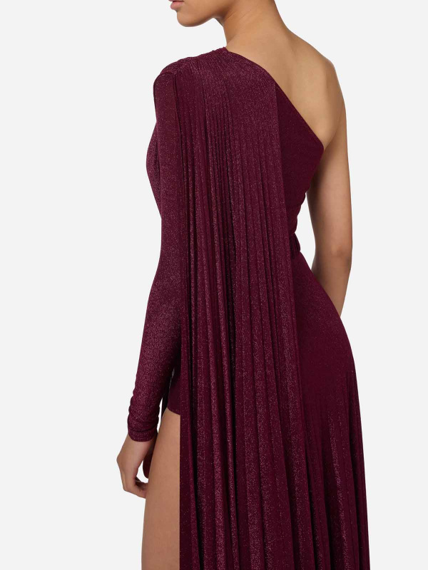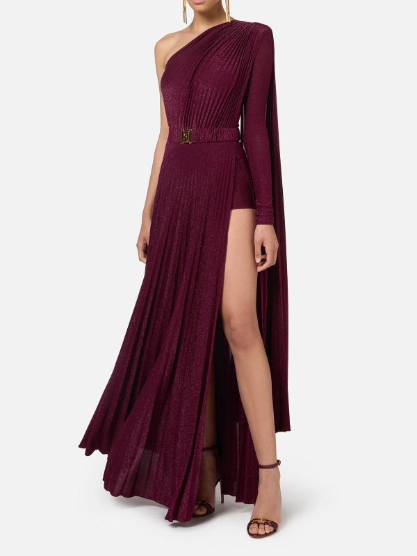 Ženska bordo Elisabetta Franchi haljina za crven tepih od nabranog žerseja od lureksa s dugim rukavima