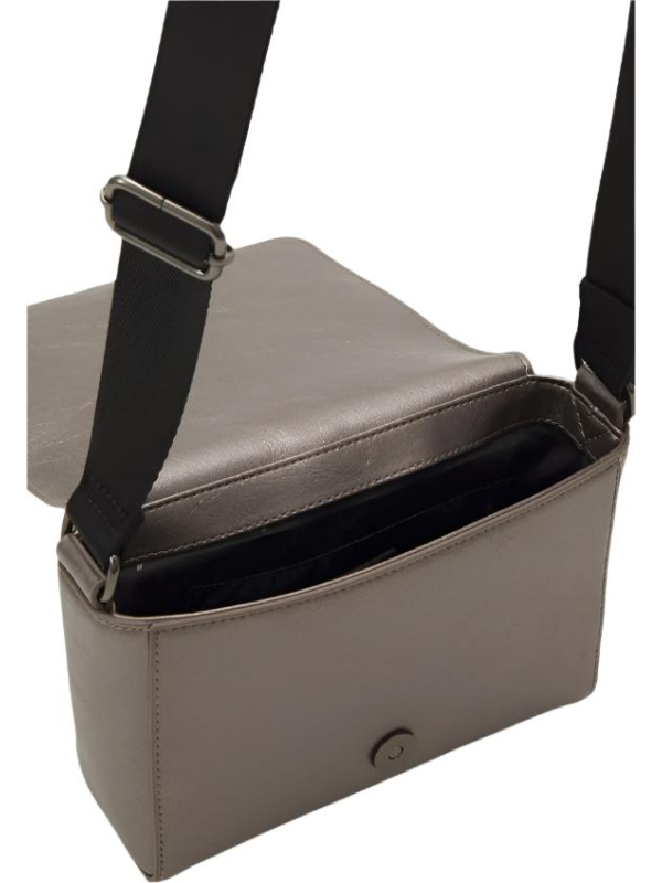 U elegantnoj srebrnoj umjetnoj koži s podesivim remenom. Glavni pretinac pričvršćen je magnetskom kopčom.