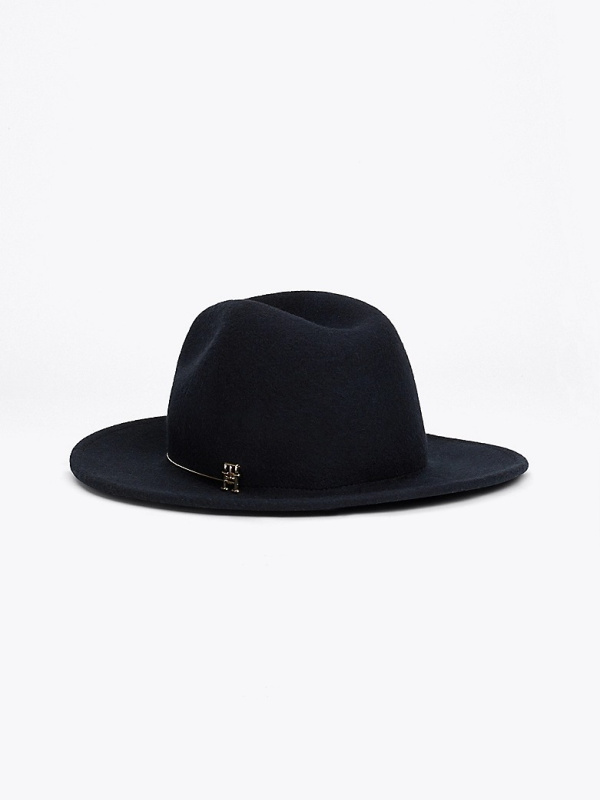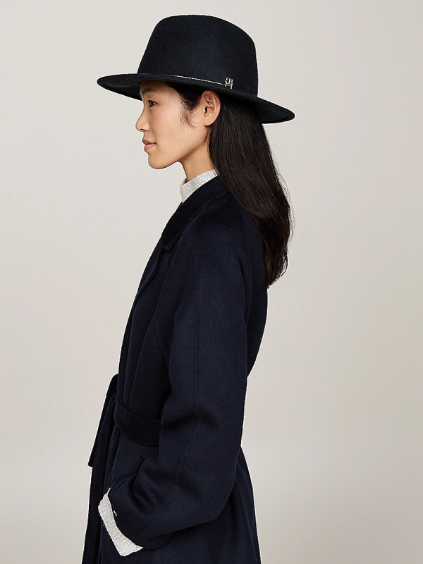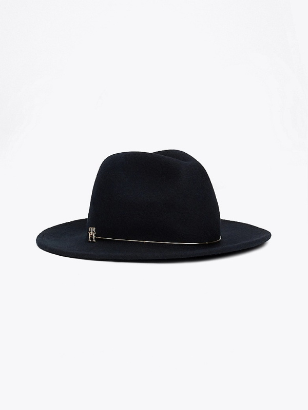 Ženski tamnoplavi Tommy Hilfiger šešir od čiste vune sa Fedora metalnom trakom