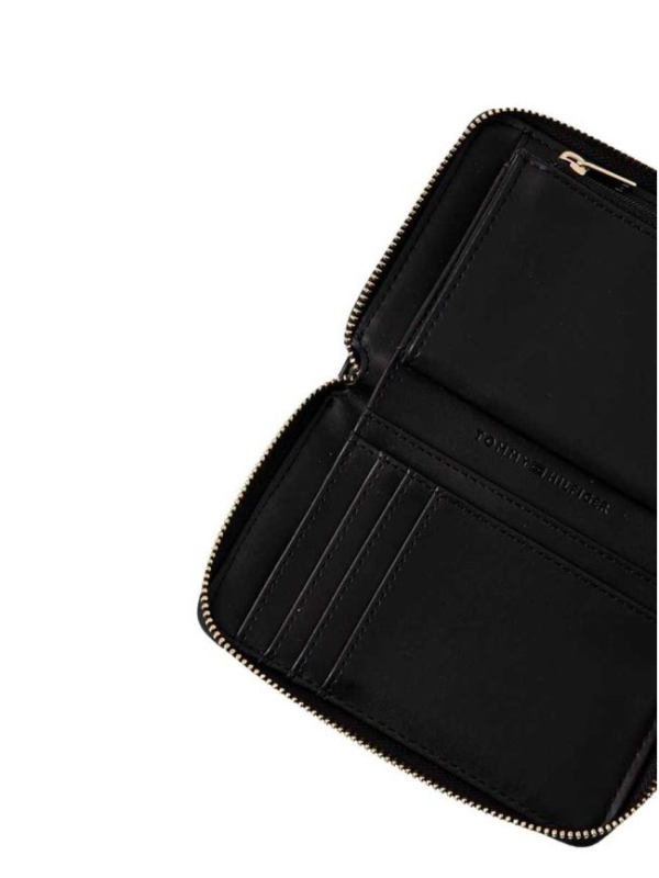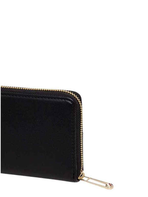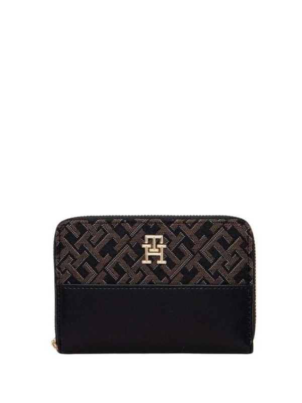 Ženski crni Tommy Hilfiger novčanik sa smeđim logo printom i metalnim TH monogramom u boji zlata