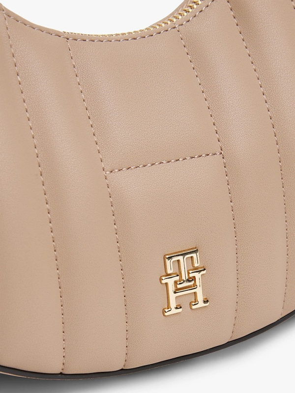 Ova torba preko ramena spaja praktičnost i eleganciju, s prošivenim detaljima, zaobljenom siluetom i blistavom pločicom s monogramom TH.