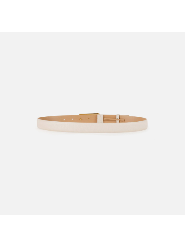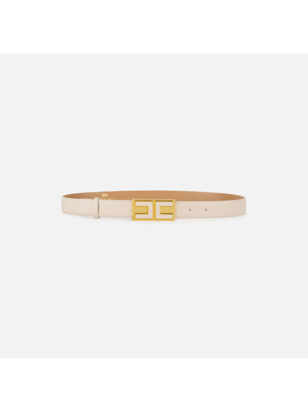 Ženski Elisabetta Franchi zaobljeni bež remen od prave kože s pločicom i kopčanjem na okrugle gumbe, karakteriziran emajliranim logotipom.