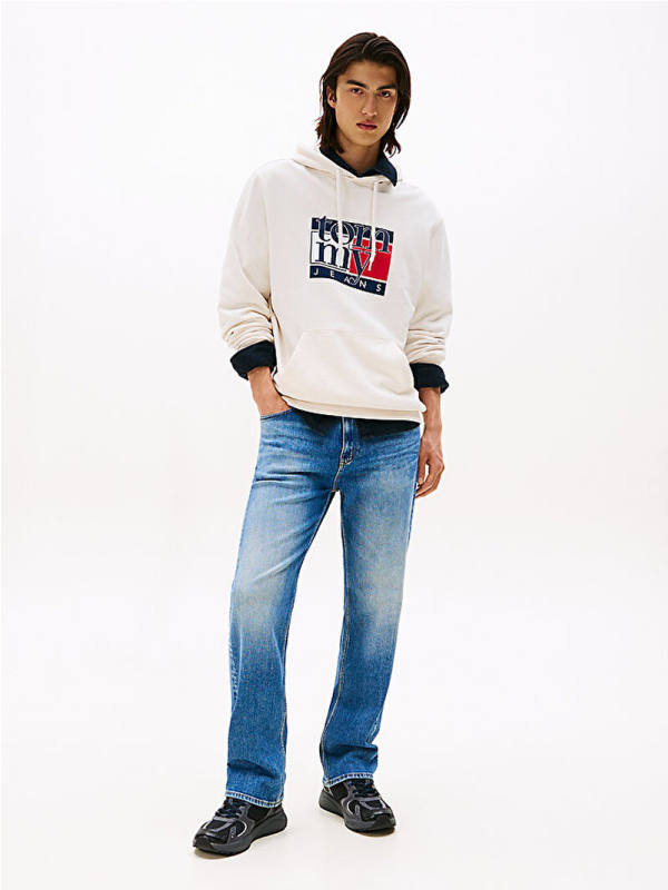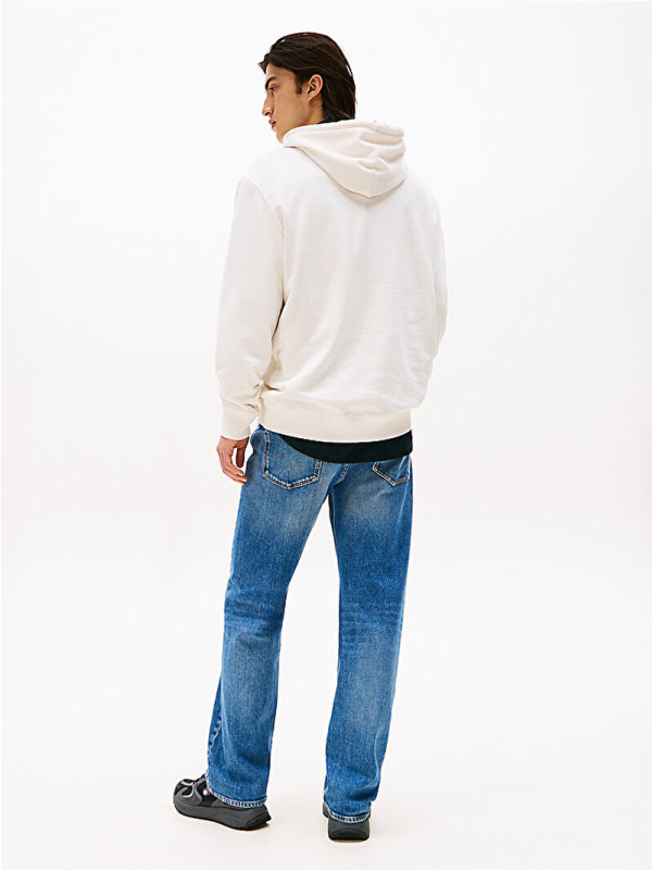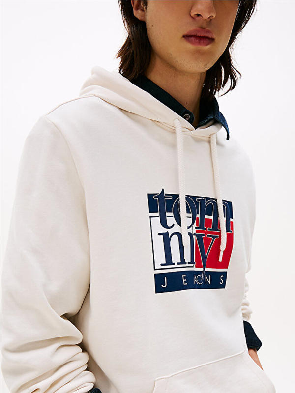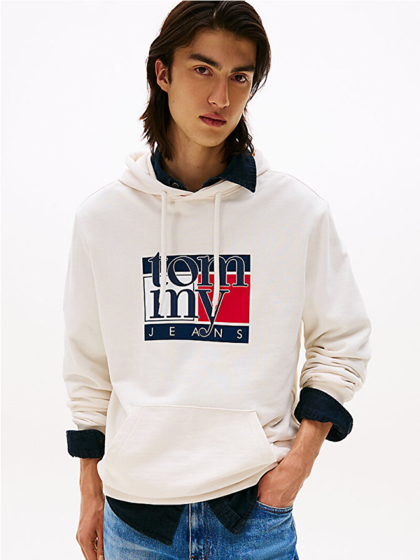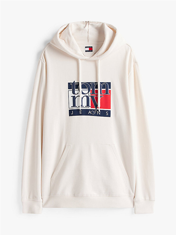 Muški krem-bijeli Tommy Hilfiger duks s kapuljačom, džepom i logo printom na prsima