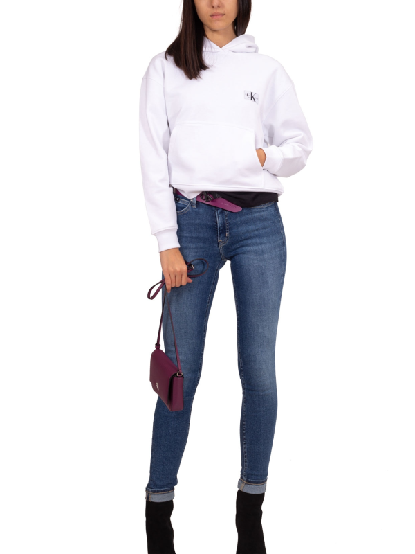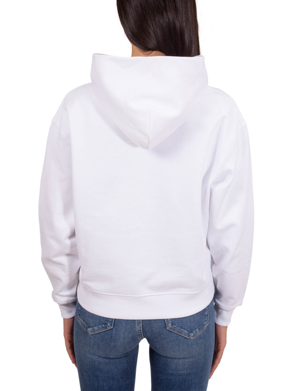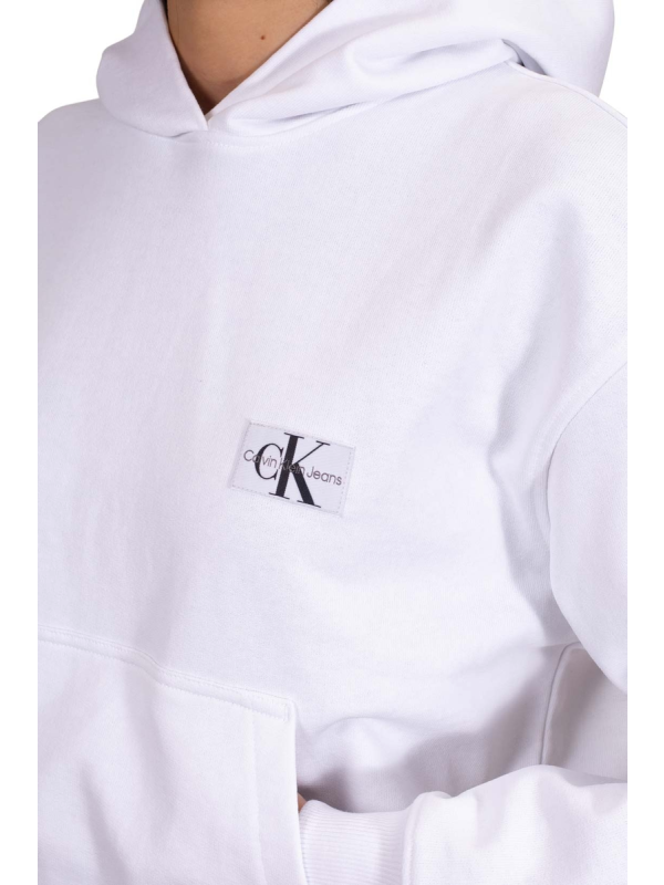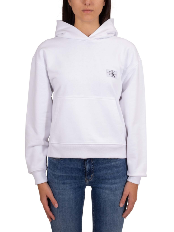 Uobičajena ženska trenirka, od čistog bijelog pamučnog frotira, s kapuljačom i logom Calvin Klein Jeans na prednjoj strani.