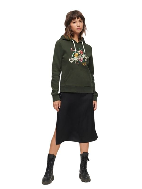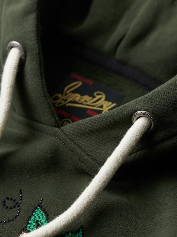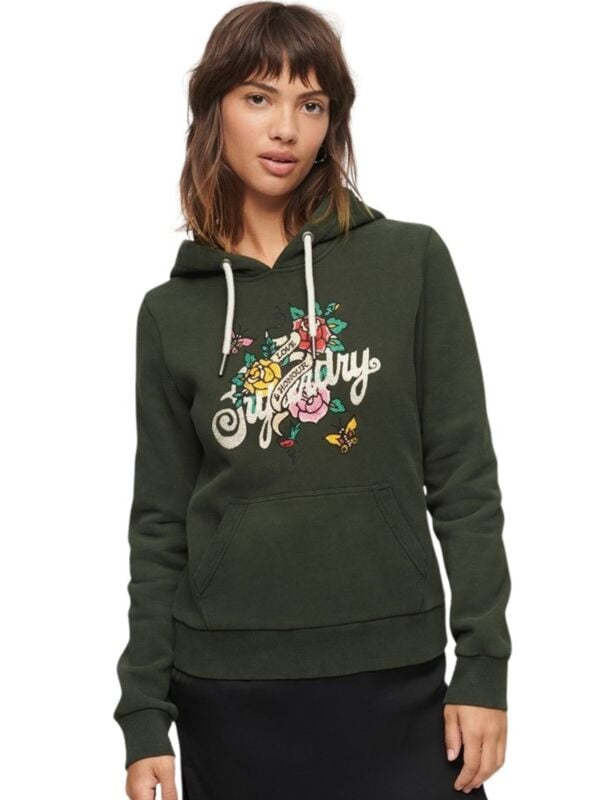 Superdry Tattoo ženski duks sa kapuljačom, prednjim džepom, printom i cirkonima.