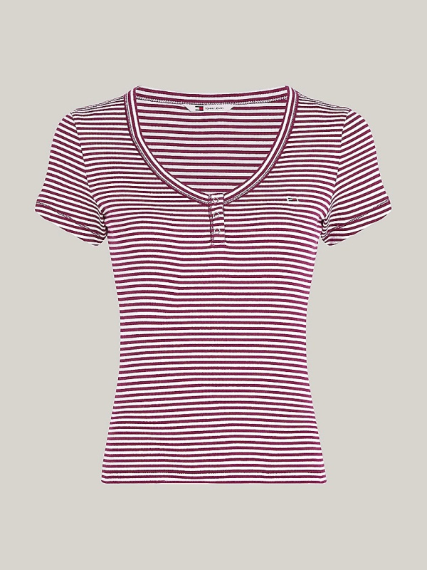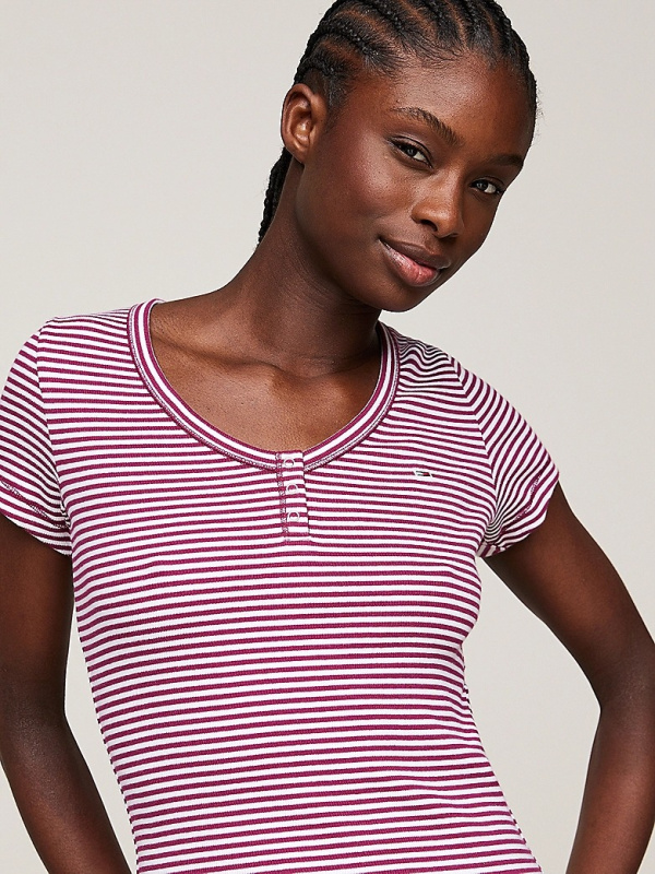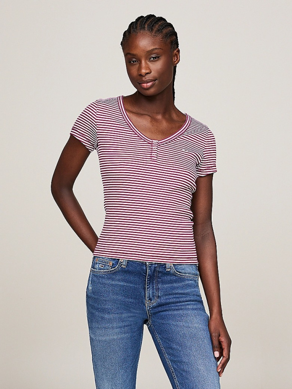 Pomiješajte svoj ležerni izgled s ovom uskom majicom s prugama po cijeloj površini i pojasom s gumbima na V-izrezu u Henley stilu.