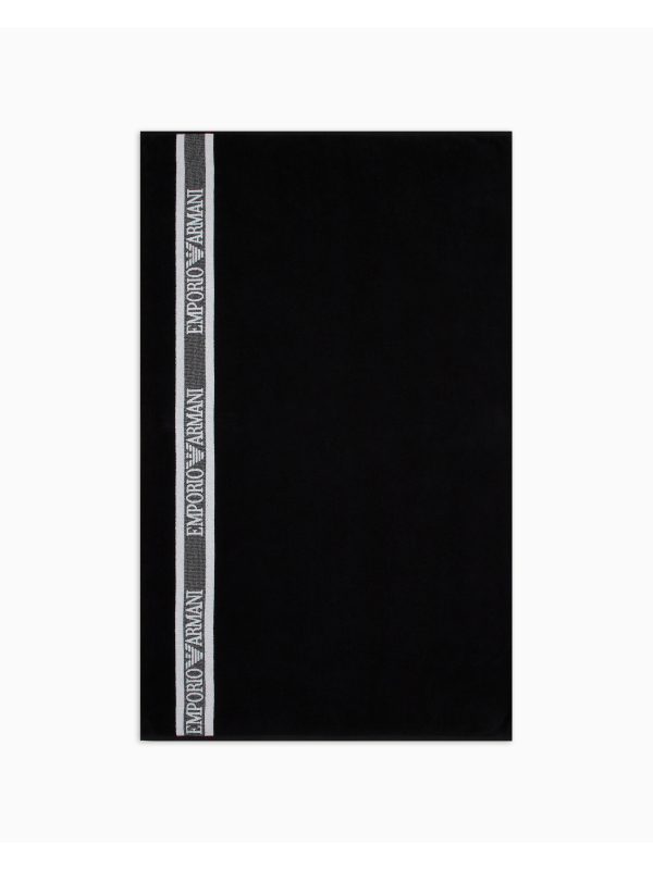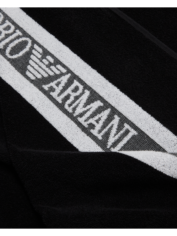 Crni EA7 ručnik za plažu izrađen od čistog pamučnog frotira s kontrastnom bočnom prugom s logom