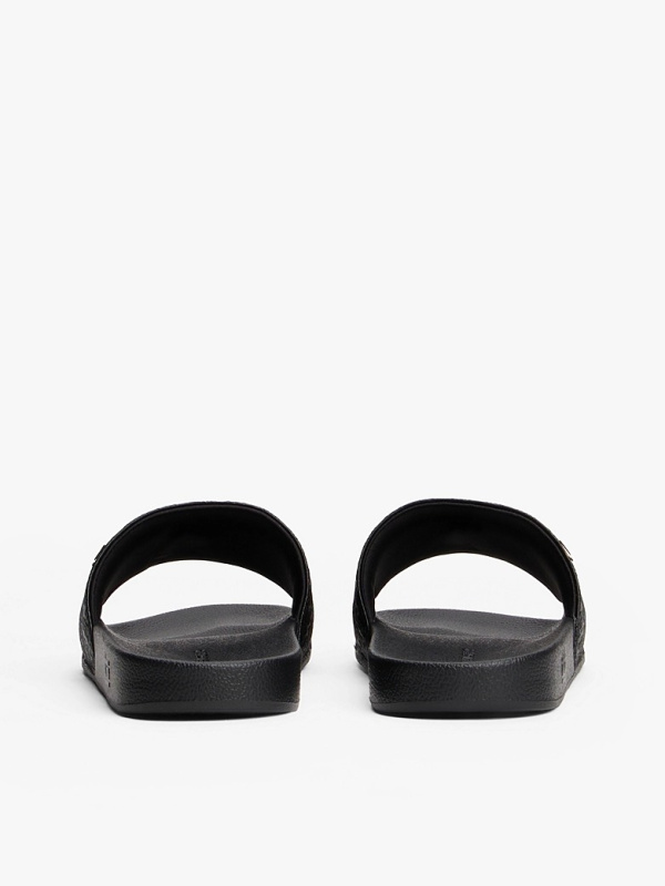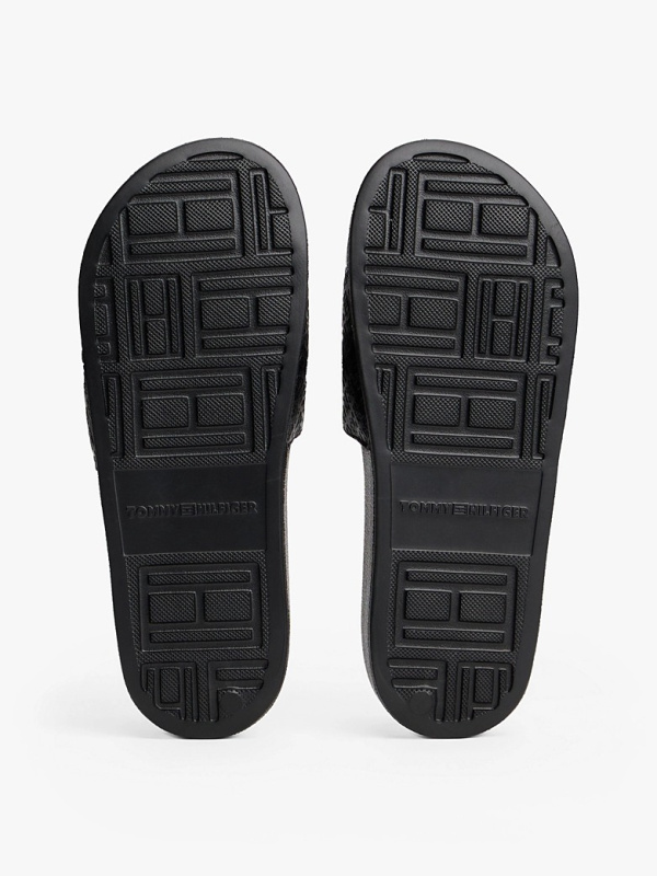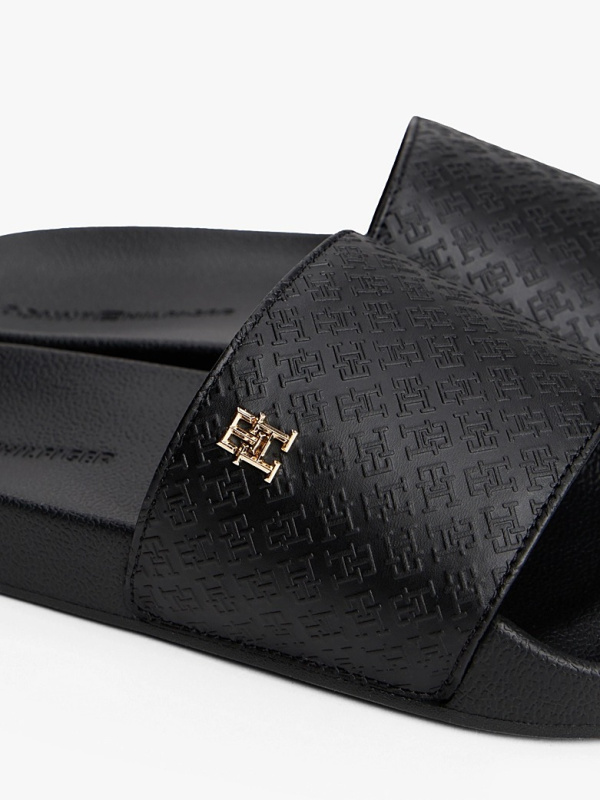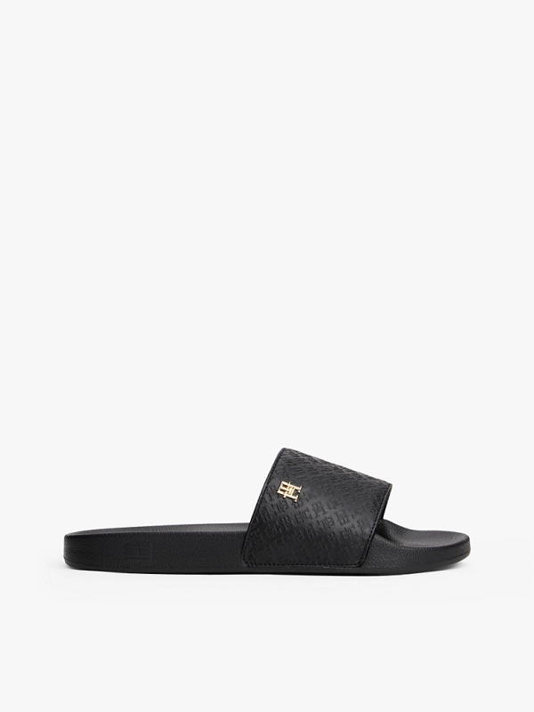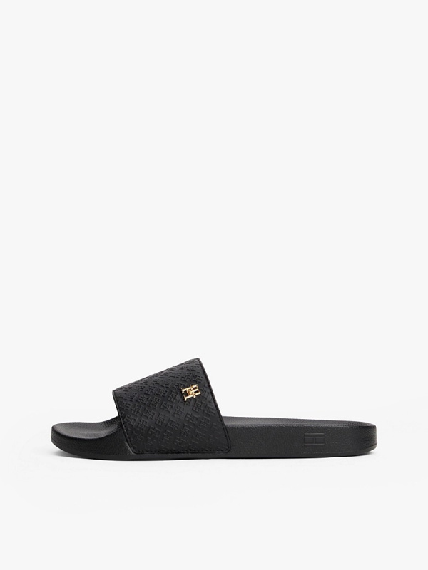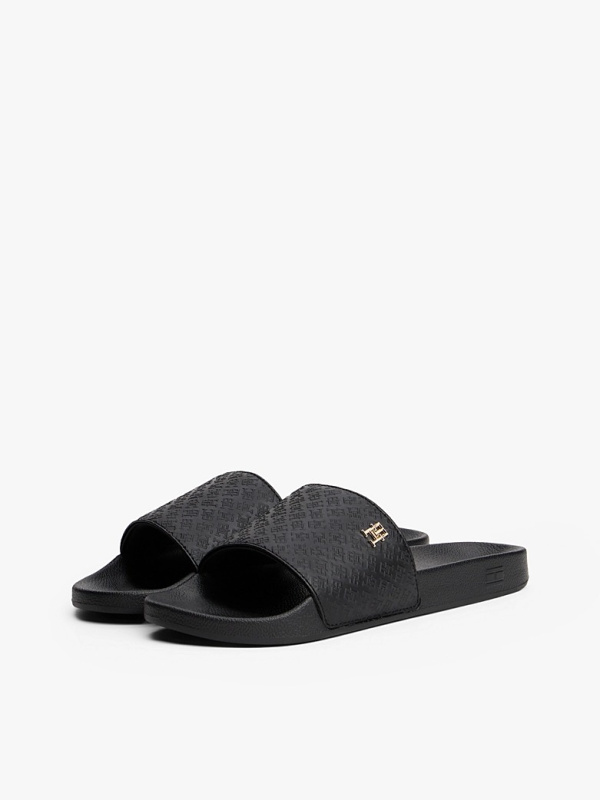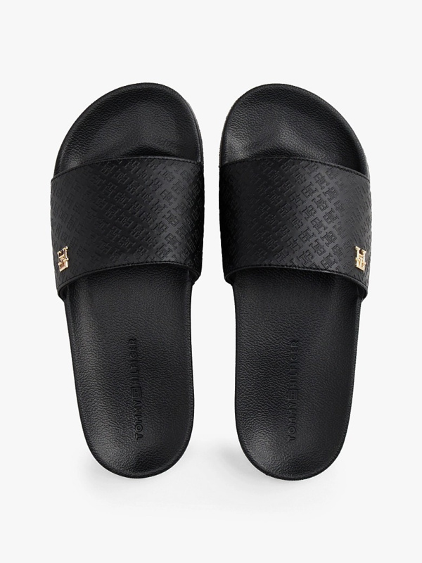 Ženske crne Tommy Hilfiger papuče sa zlatnim logom i all-over monogramom