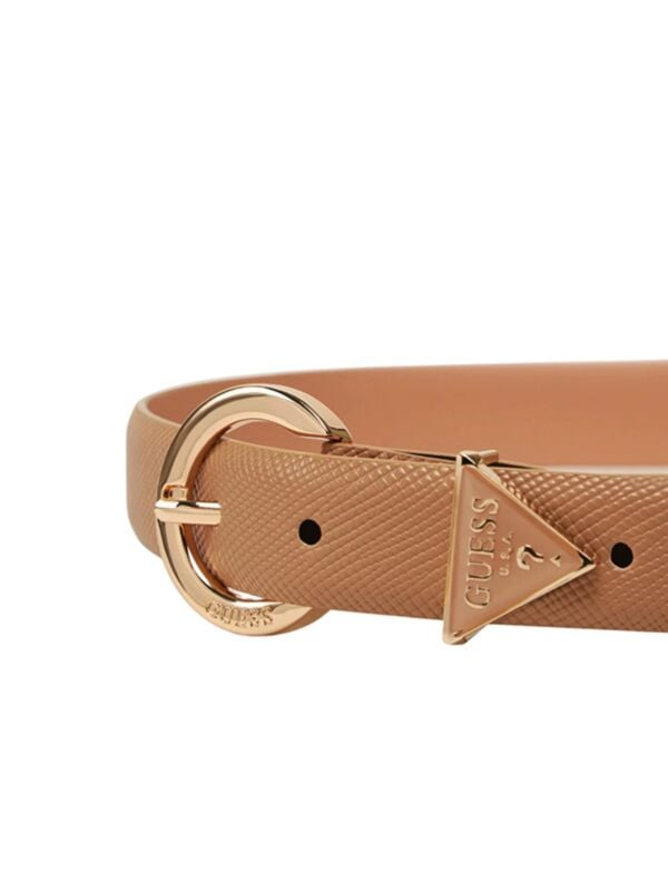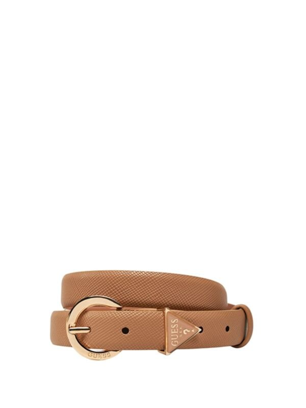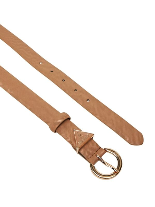 Ženski smeđi teksturirani remen s okruglom šnalom i trouglastim logo detaljem