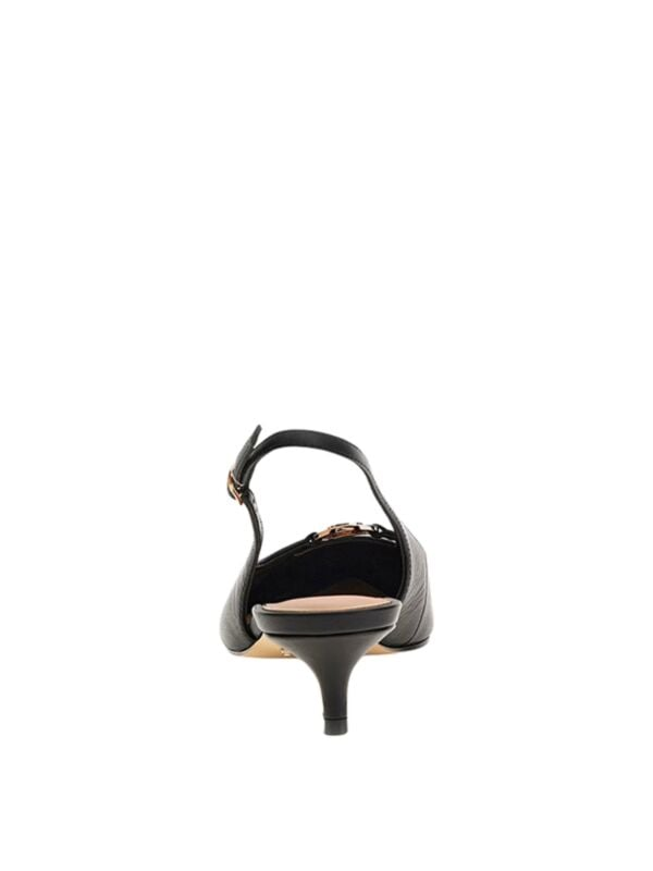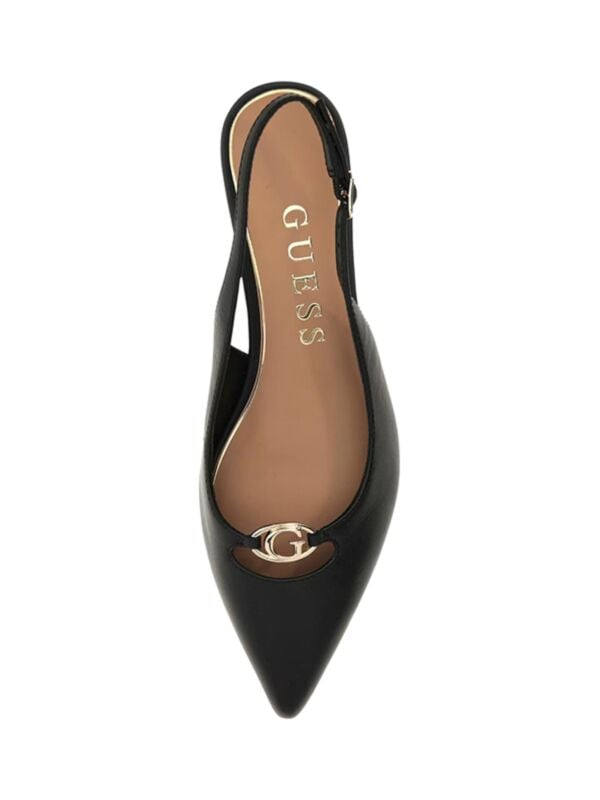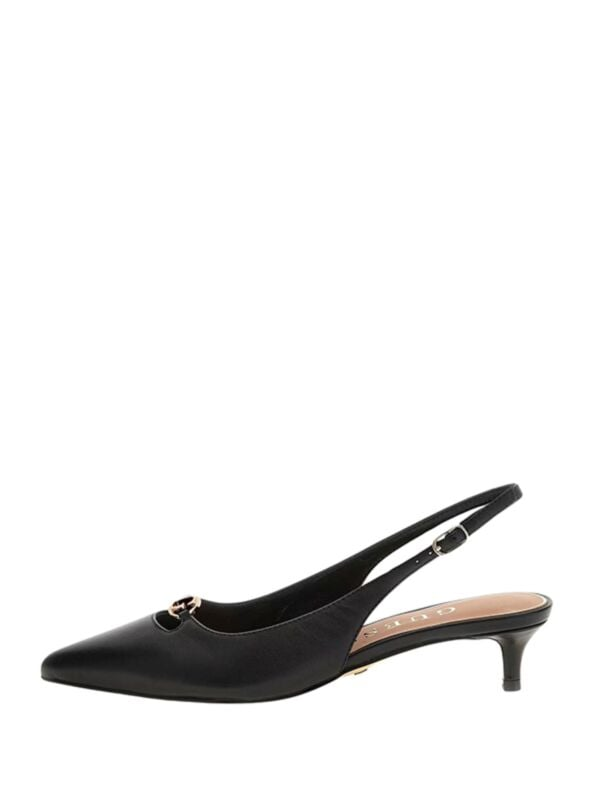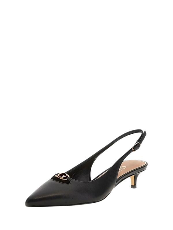 Ženske crne kožne Guess cipele sa špicastim prstima i niskom kitten potpeticom s logo detaljima
