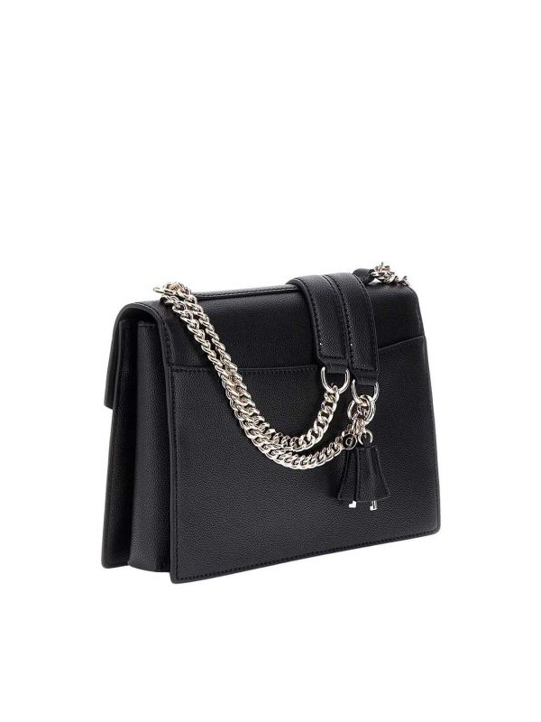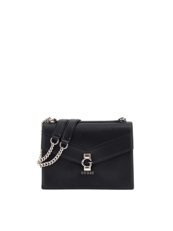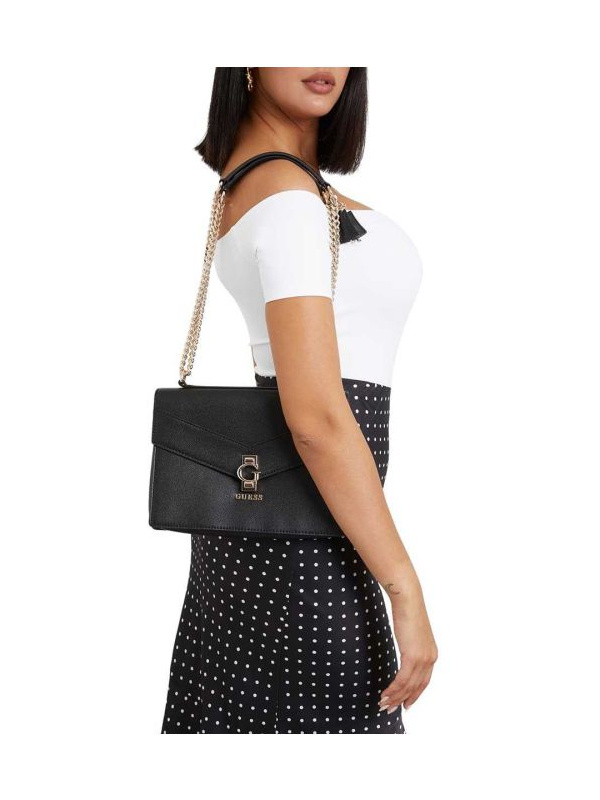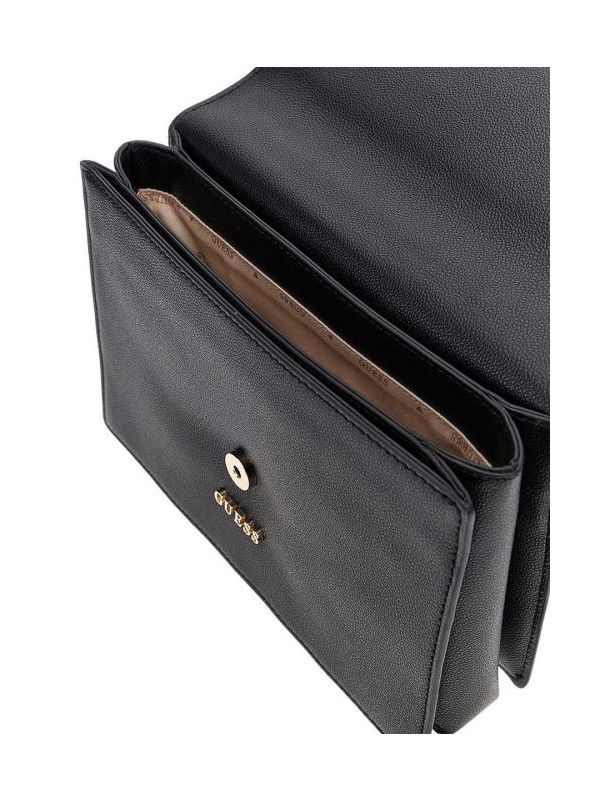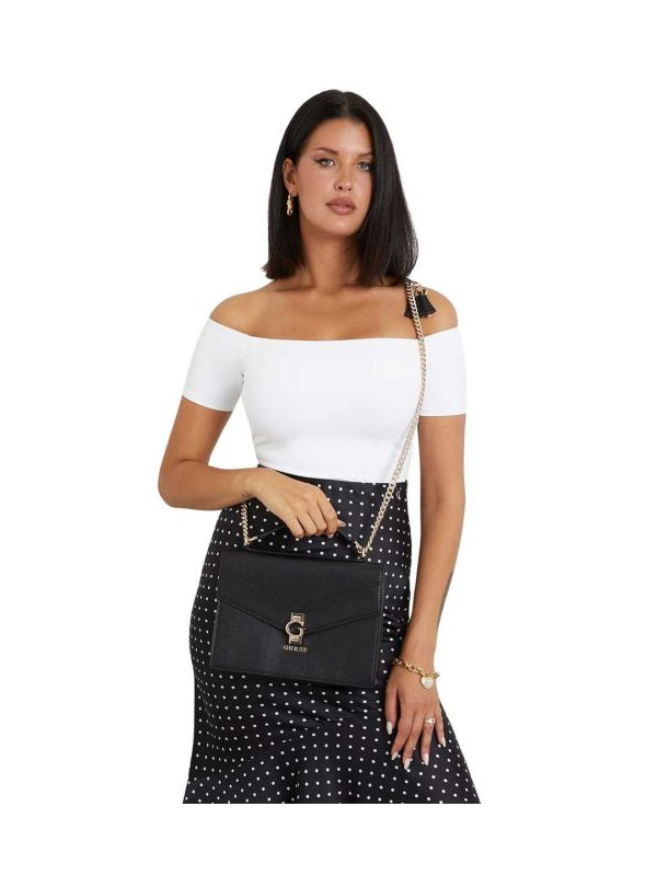 Ženska crna Guess Emera Girlfriend elegantna mala torba sa preklopom i logo kopčom