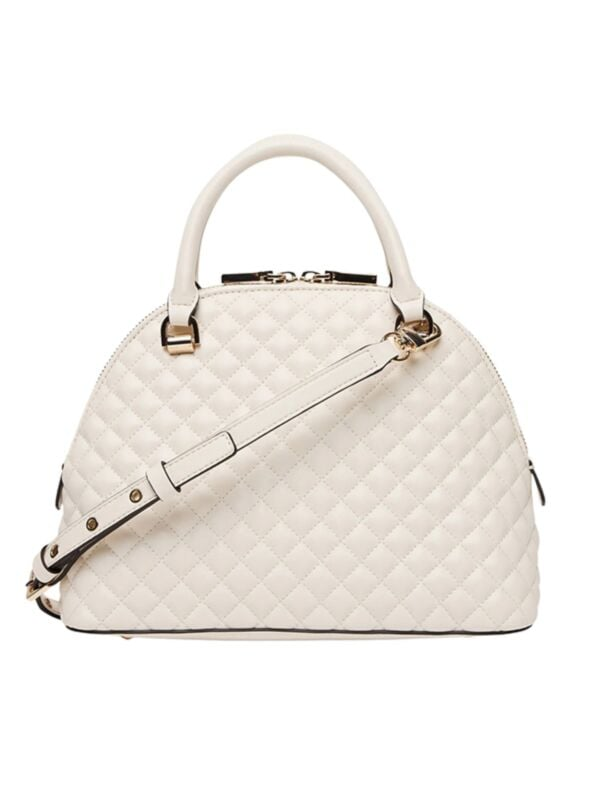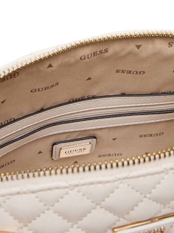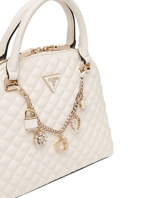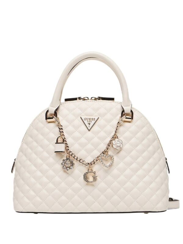 Ženska prošivena Guess Everlee Dome Satchel bež torba s ručkom i lancem s privjescima