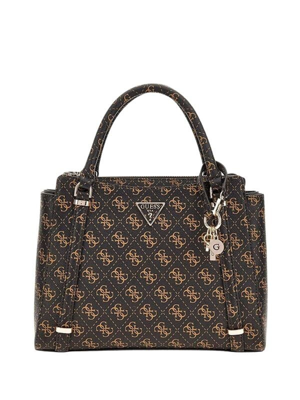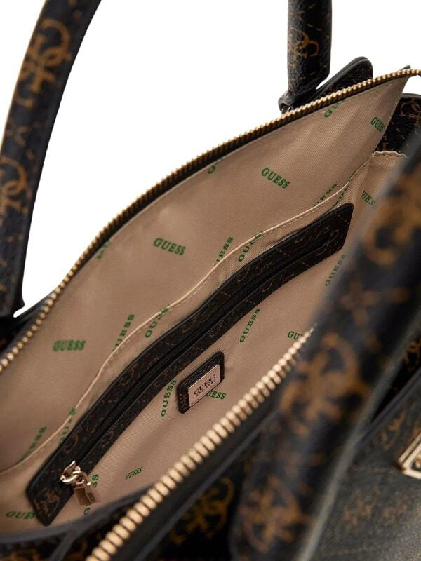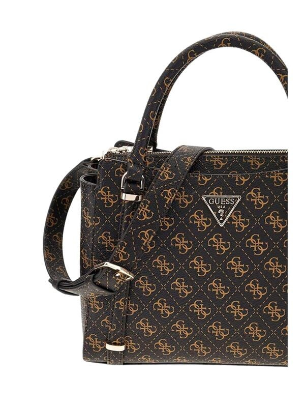 Ženska tamnosmeđa Guess Carly logo torba sa ručkom i slim remenom