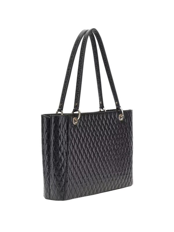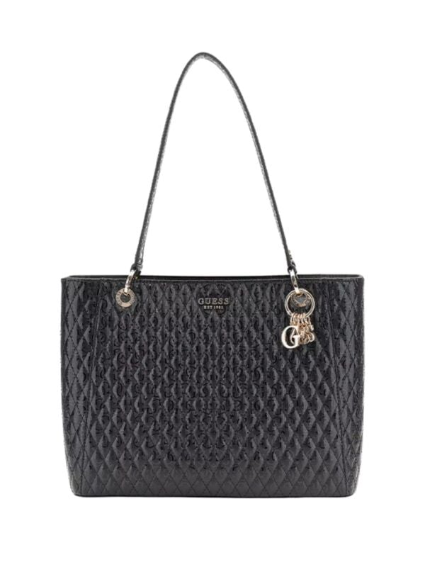 Ženska crna sjajna Guess Betula Noel tote torba sa logo printom