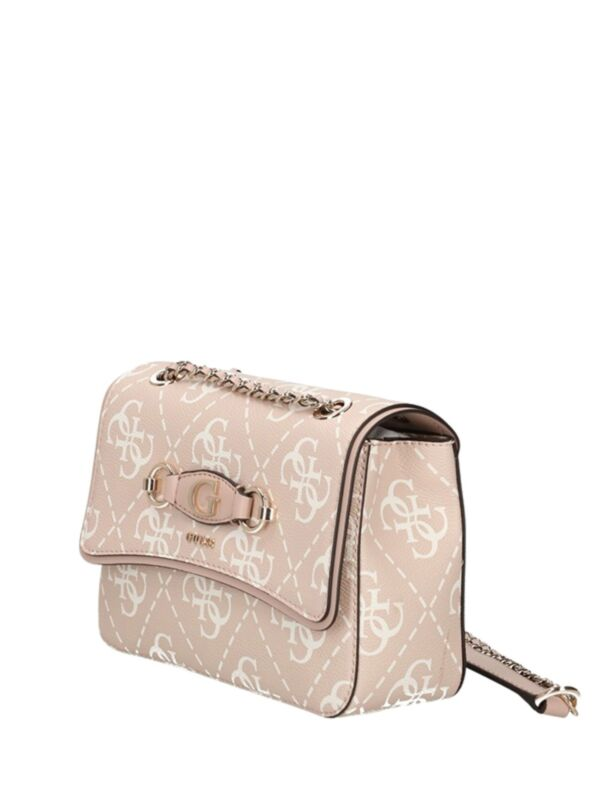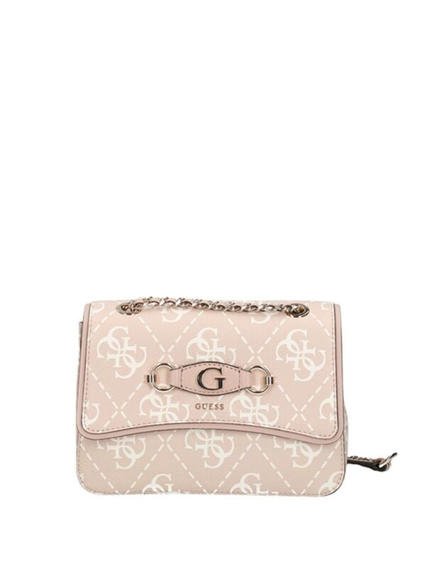Ženska bež-roza Guess torbica sa kaišem sa lancem s all-over monogramom