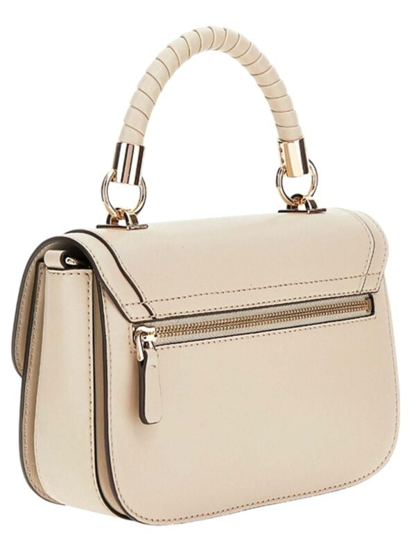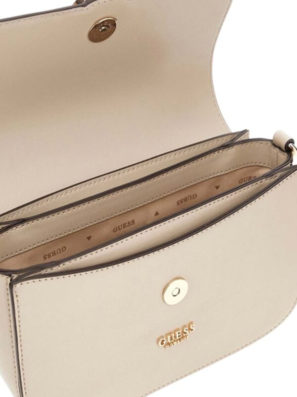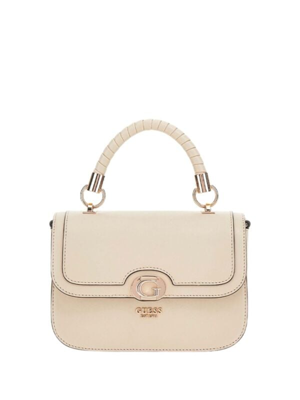 Ženska Guess Orlina bež torbica na preklop sa logo kopčom i uvijenom ručkom