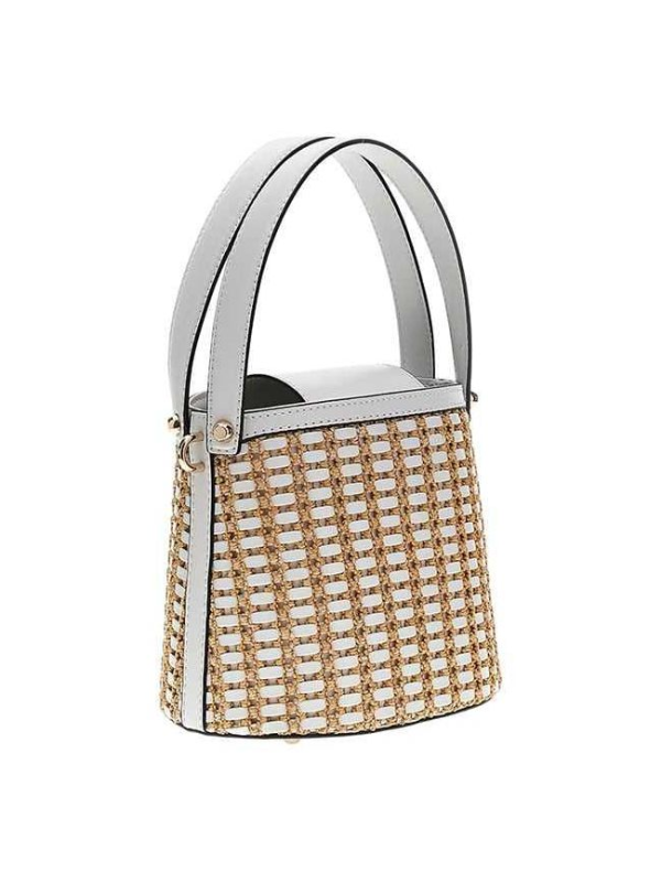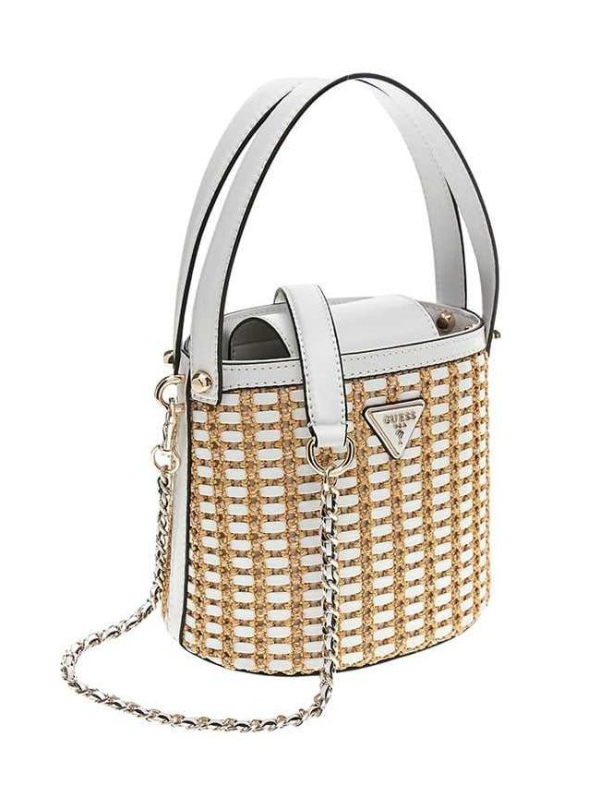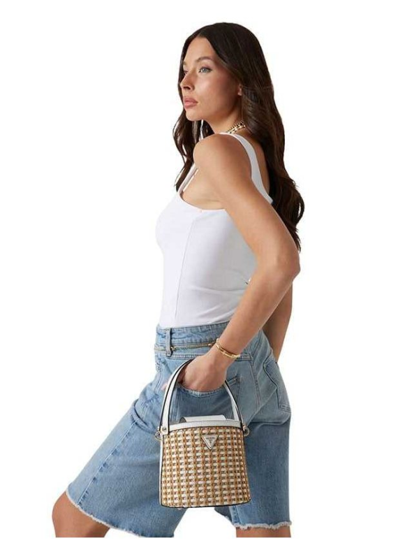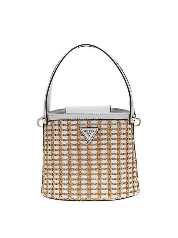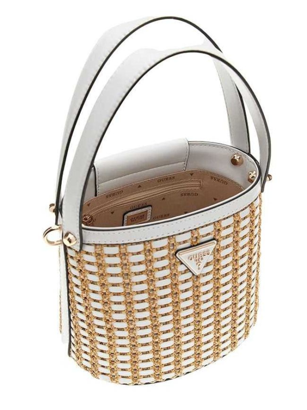Ženska bež Guess Atalia bucket torbica s pletenim dizajnom i logom