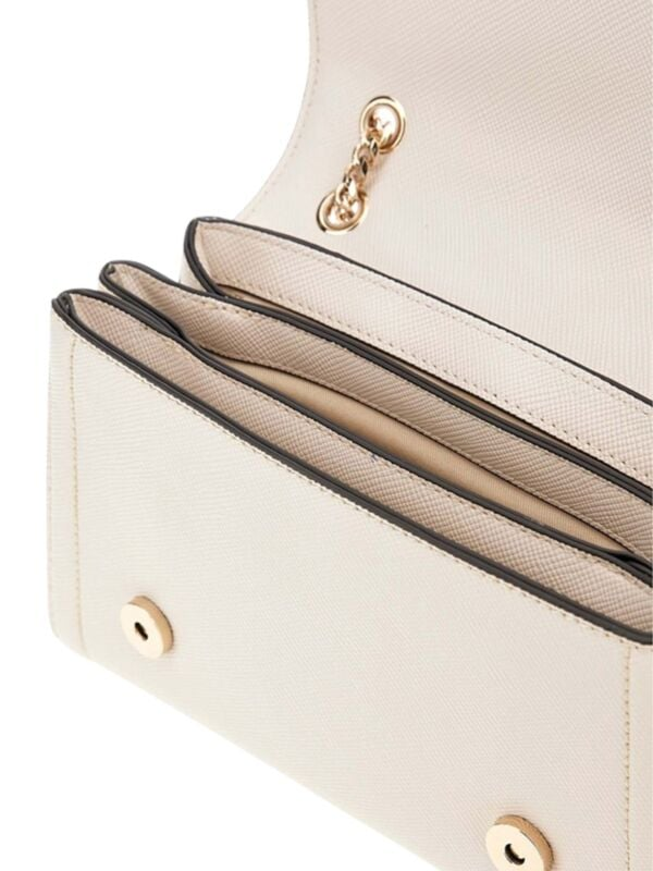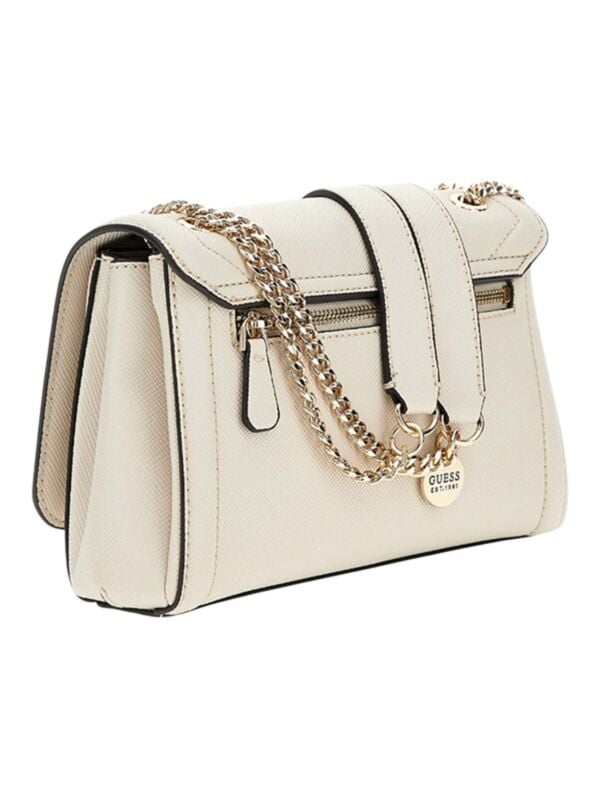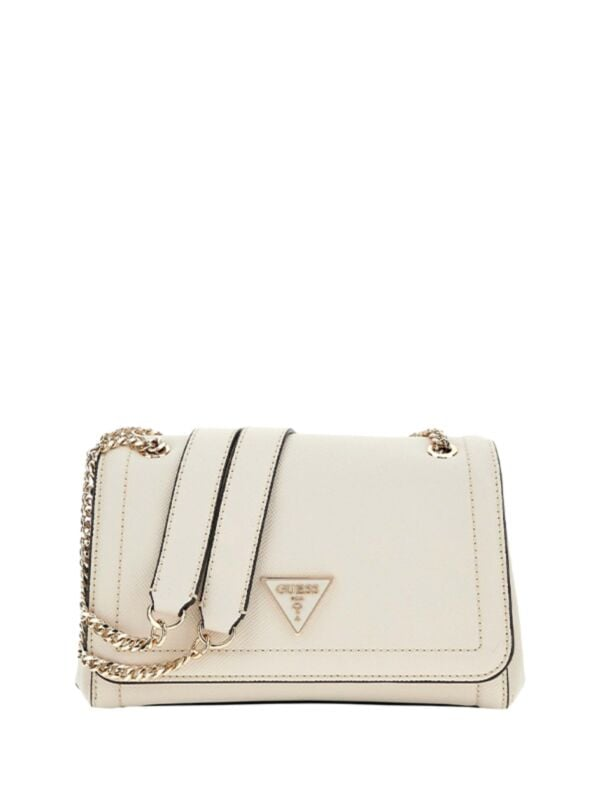 Ženska Guess Noelle krem torbica na preklop s trouglastom kopčom