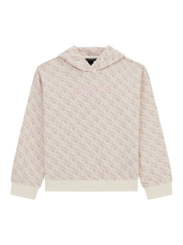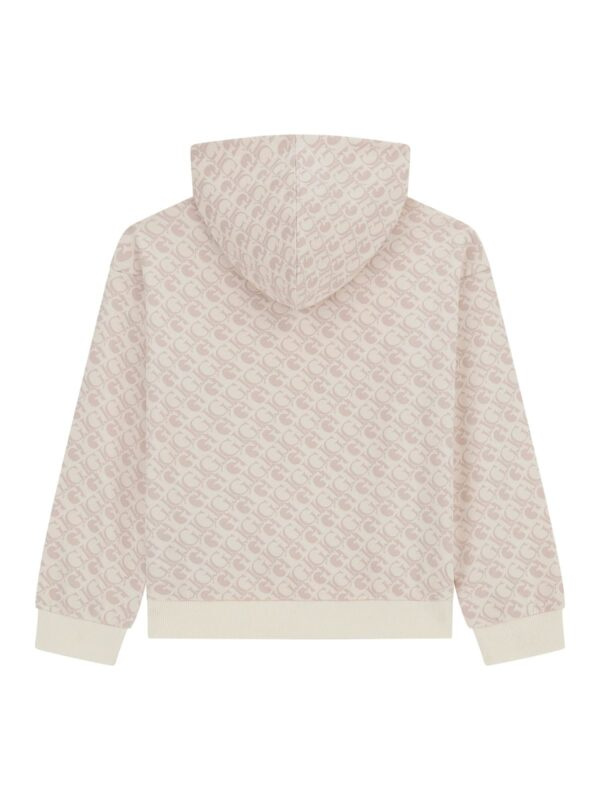Trenerka za djevojčice predimenzioniranog kroja s kapuljačom i izvezenim Guess logom u posebnom printu, izrađena od organskog pamuka u bež nijansi.