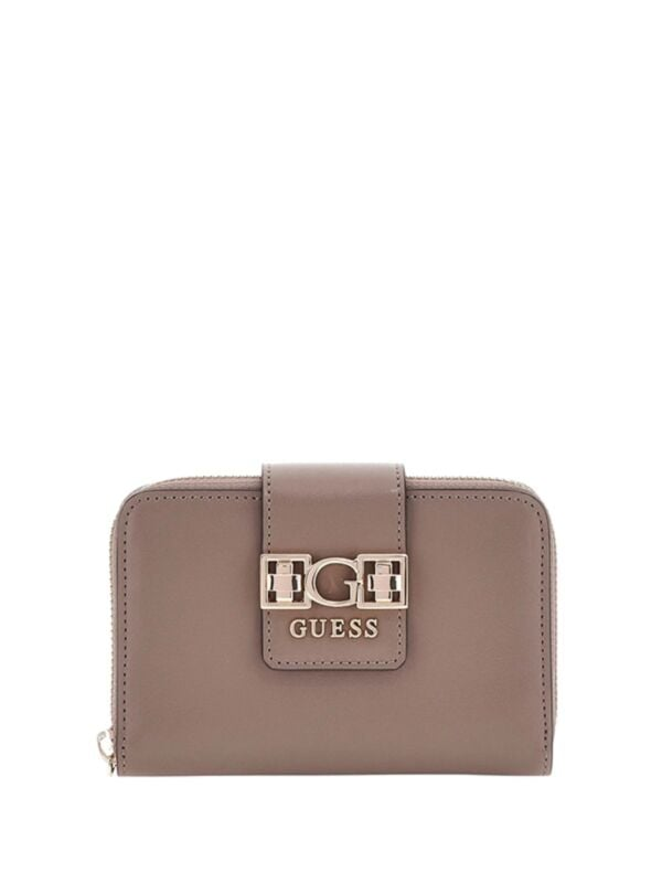 Ženski tamnosmeđi Guess novčanik s logo remenom i zipom