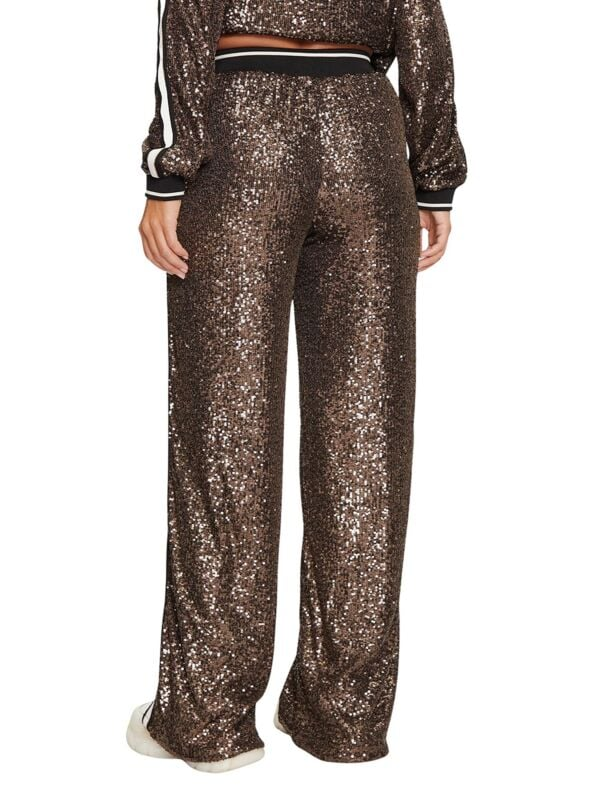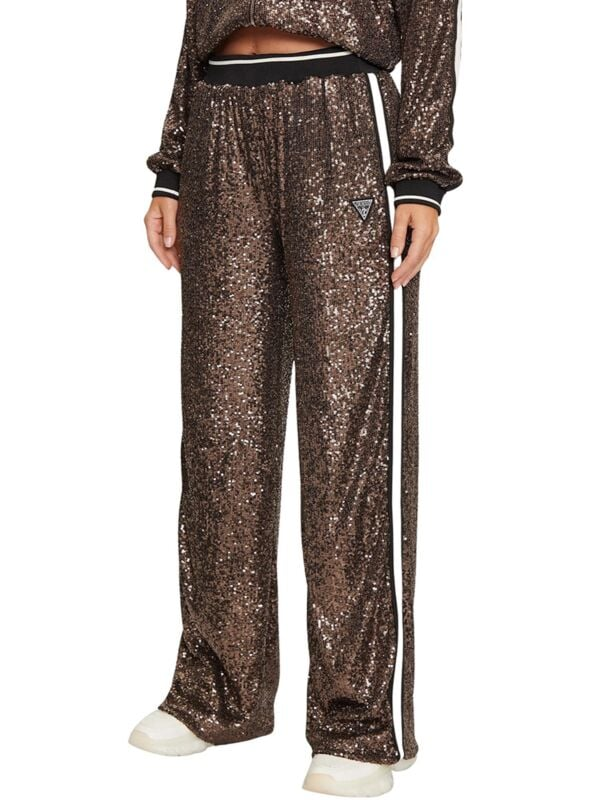 Donji dio ženske smeđe šljokičaste Guess trenerke sa širokim nogavicama i logom