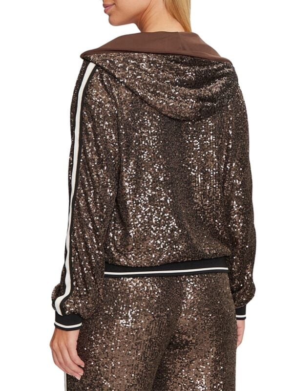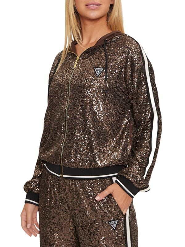 Donji dio ženske smeđe šljokičaste Guess trenerke s kapuljačom i zipom