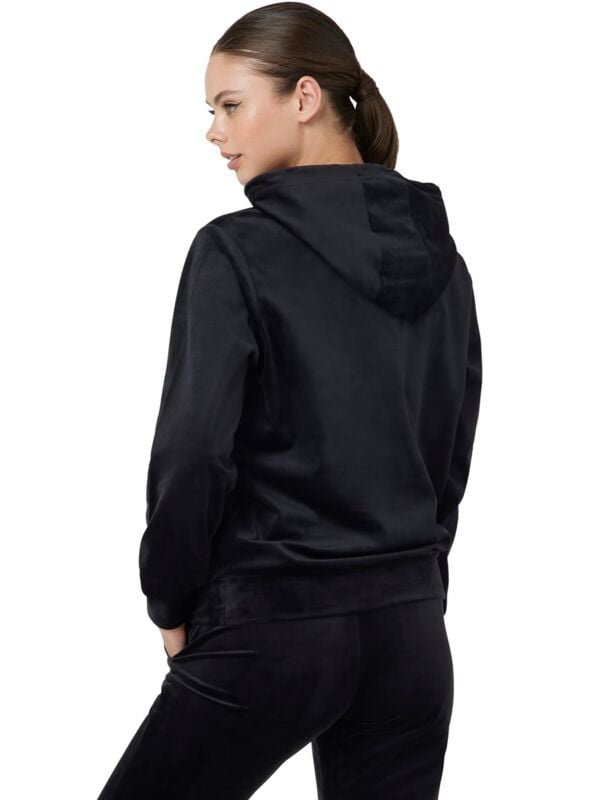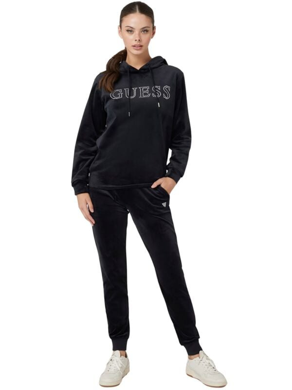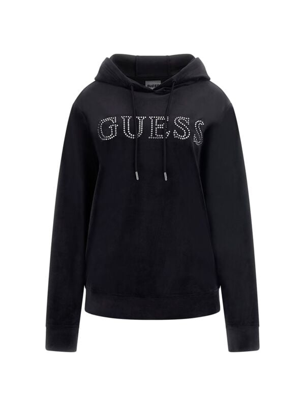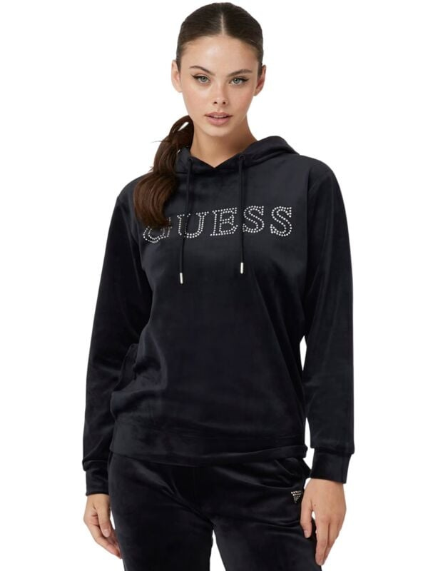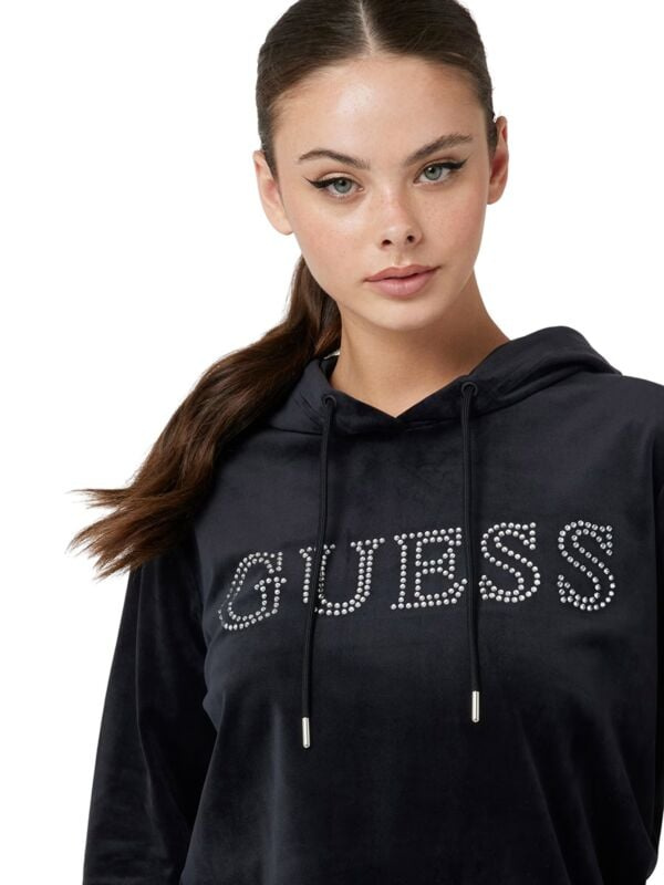 Ženska crna plišana Guess dukserica sa kapuljačom i vezicama