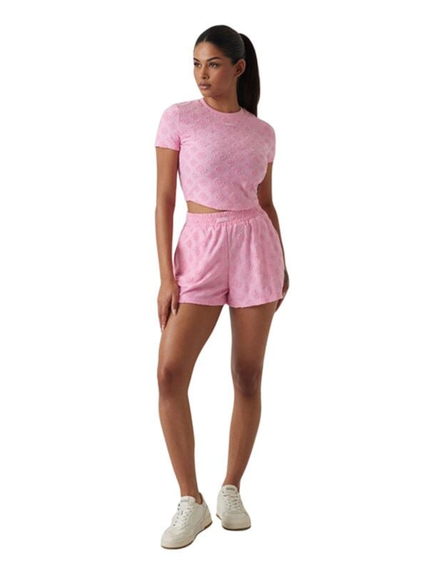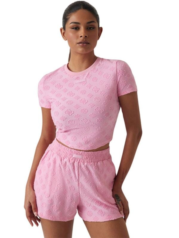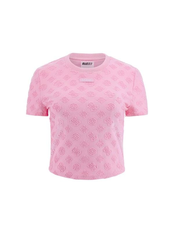Ženska roza Guess majica kratkih rukava s all-over reljefnim monogramom