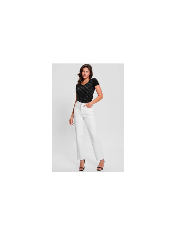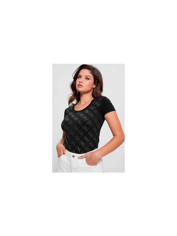 Ženska pamučna crna Guess majica s all-over monogramima i dubokim izrezom