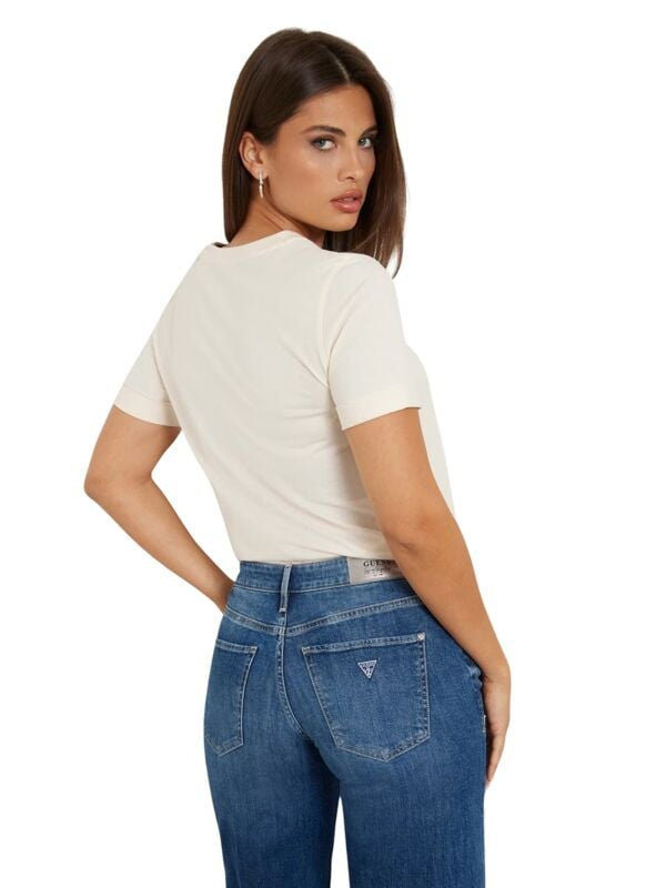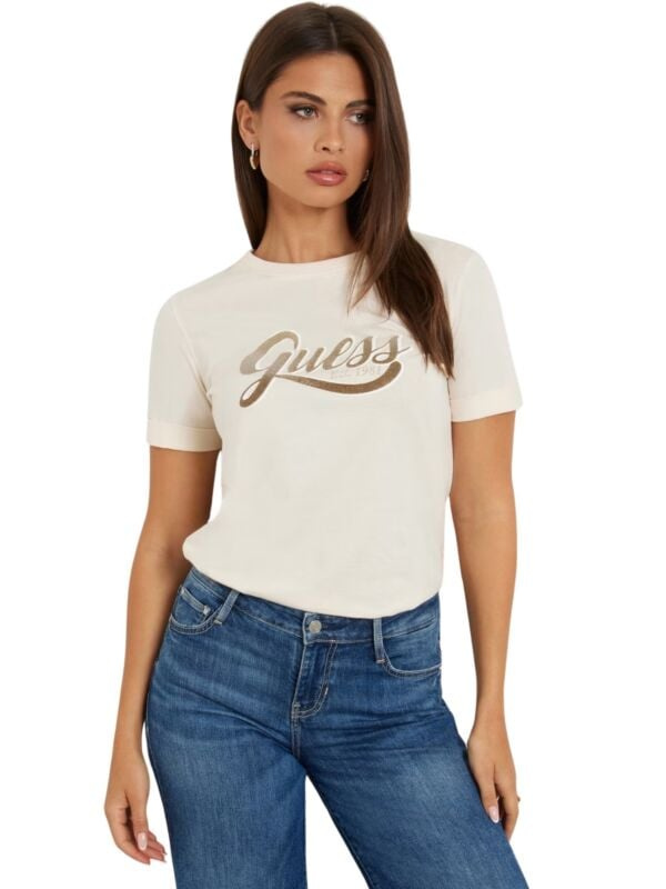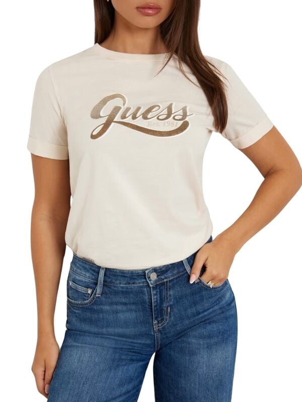 Ženska bež Guess majica kratkih rukava s logo printom na prsima