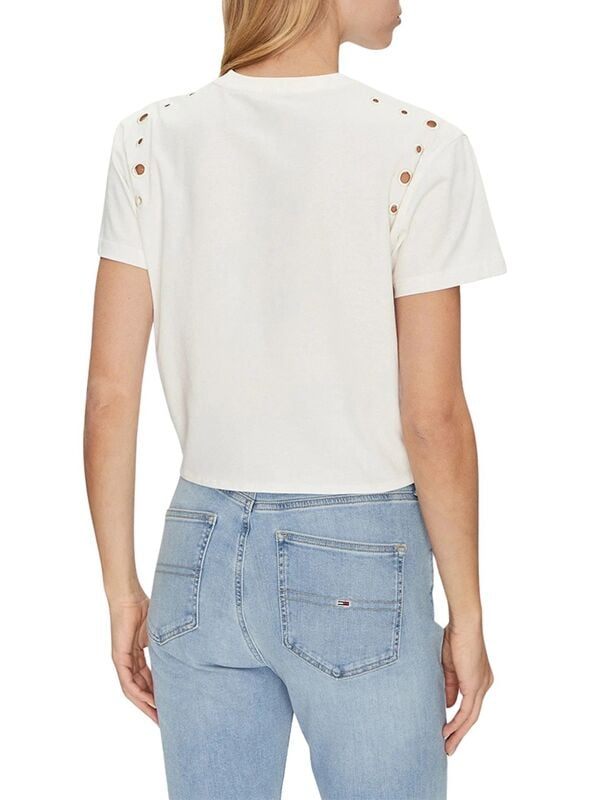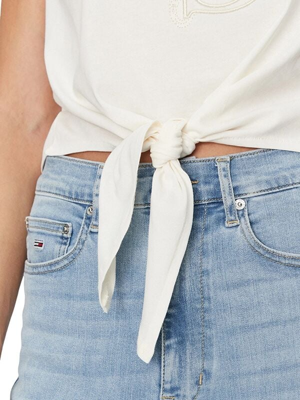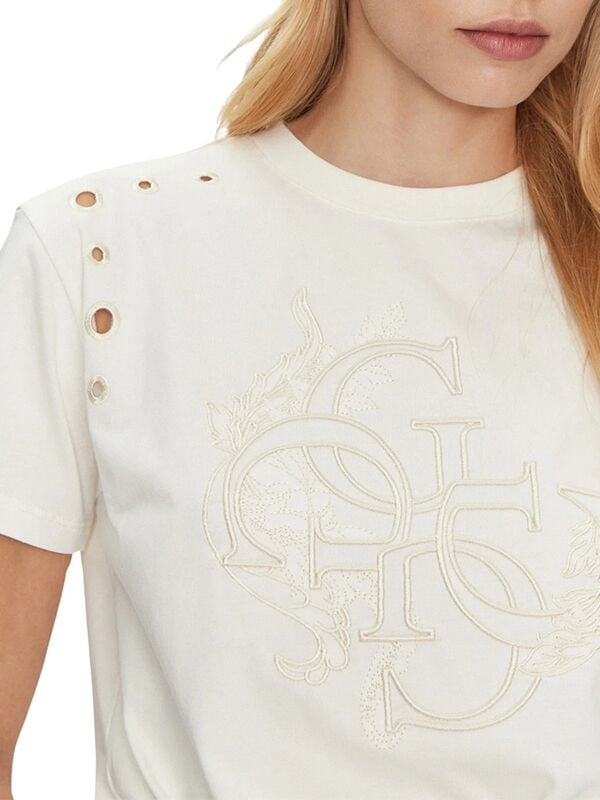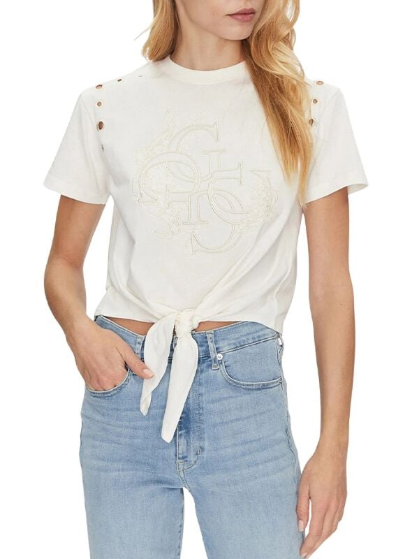 Ženska bijela Guess majica kratkih rukava s monogramom, čvorom i prorezima