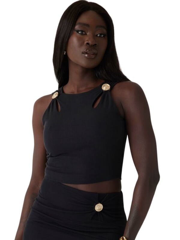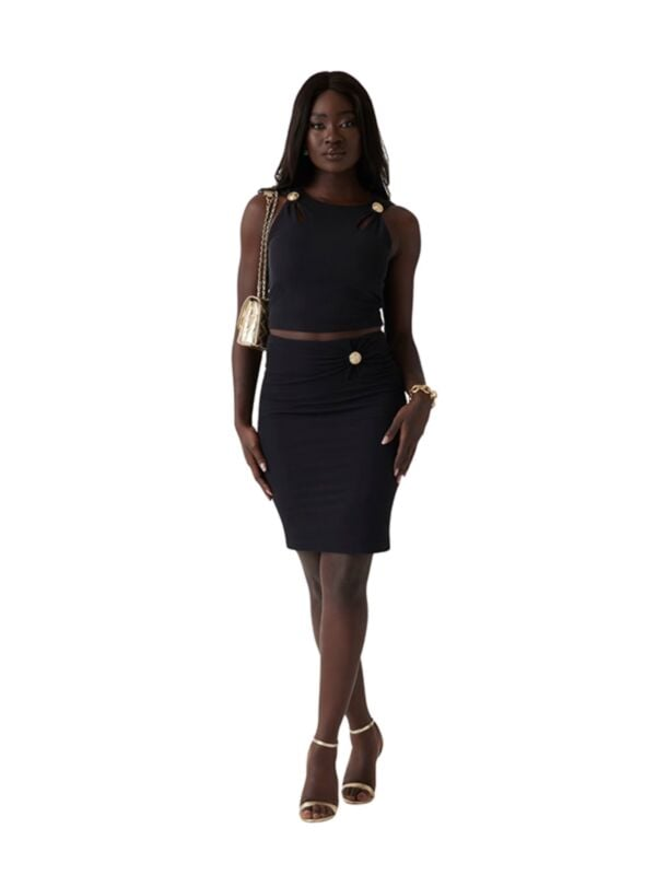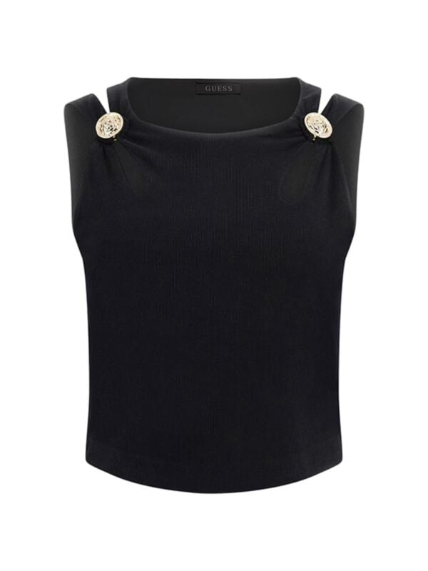 Ženski crni Guess Zama rebrasti crop top sa prorezima i logo detaljima