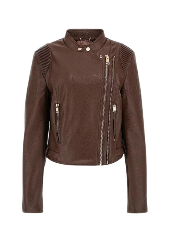 Ženska smeđa Guess bajkerska jakna s asimetričnim zip kopčanjem