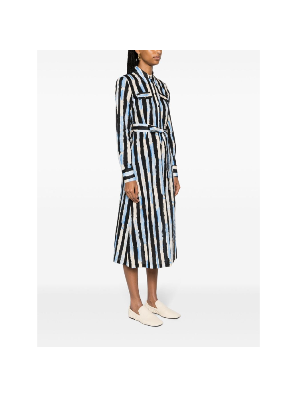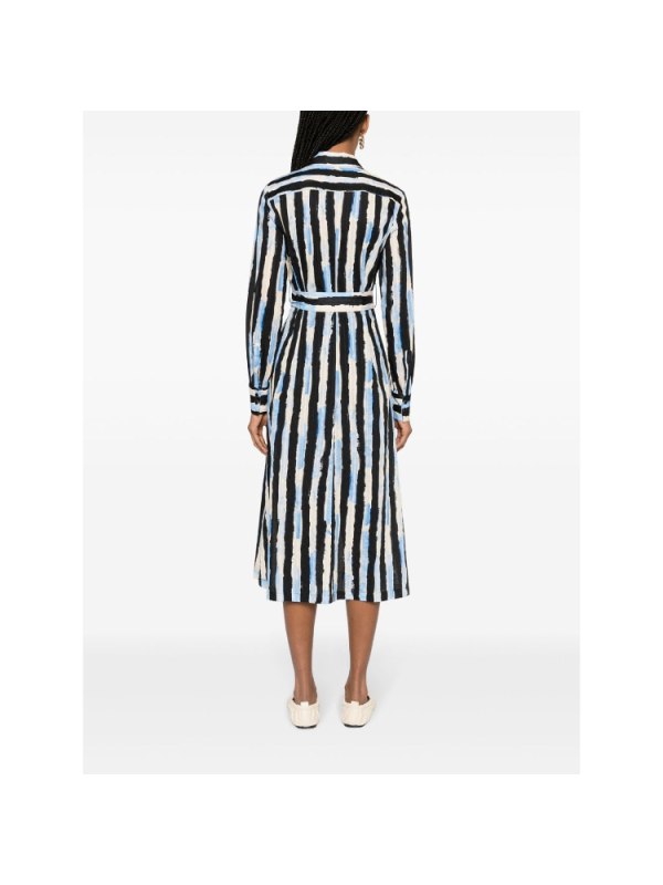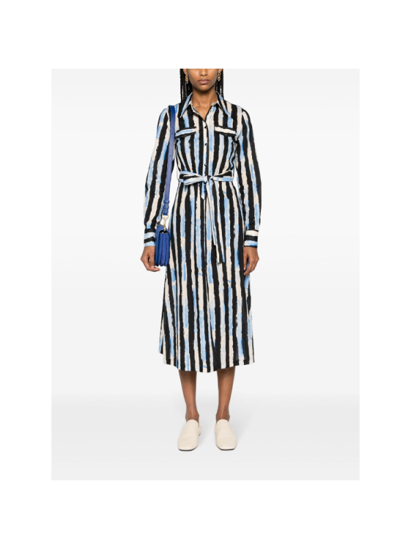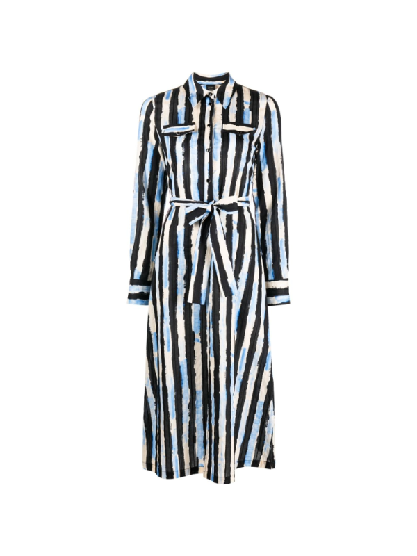 Ova PINKO haljina otisnuta je umjetnim prugama koje izgledaju kao da su naslikane izravno na pamučnoj podlozi.