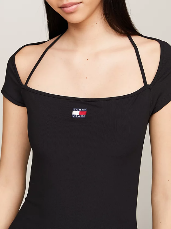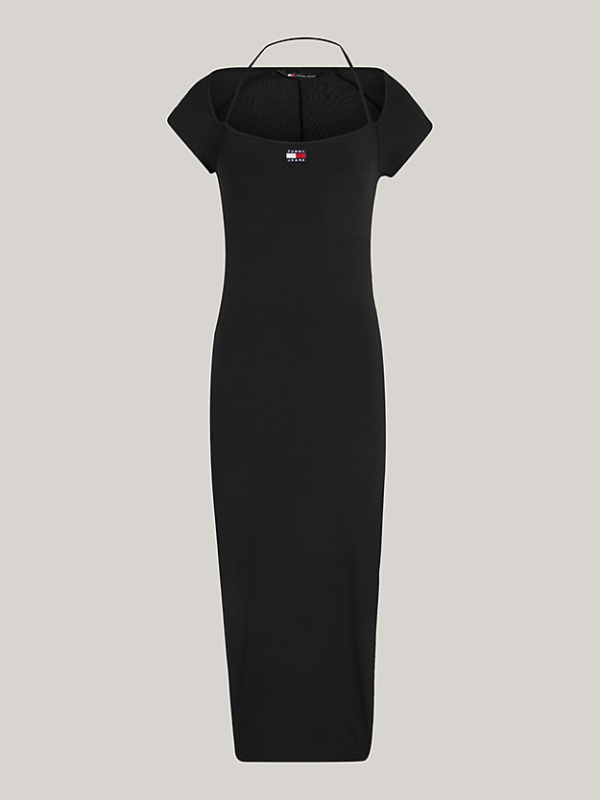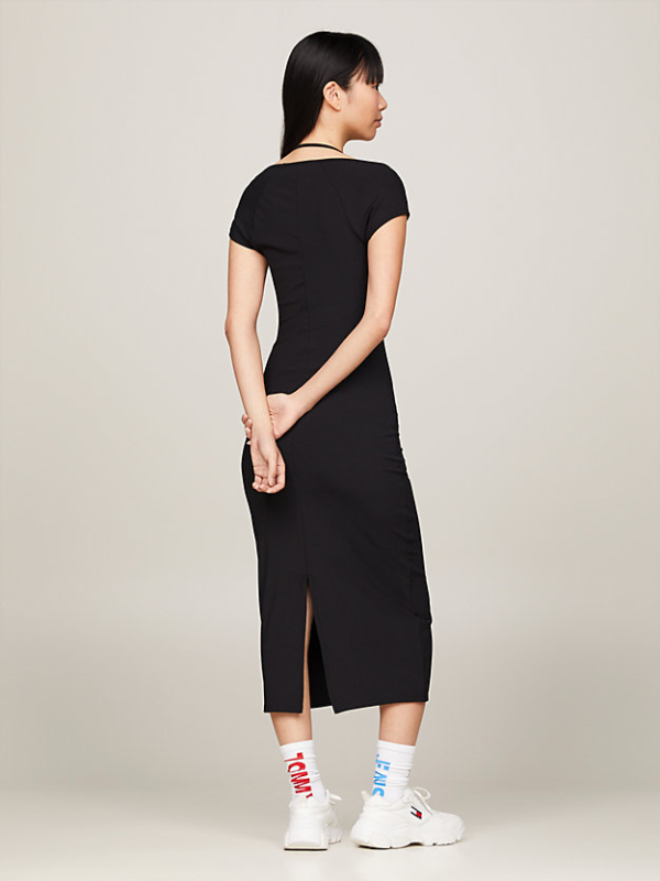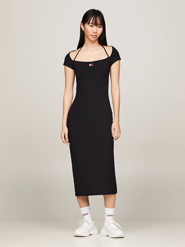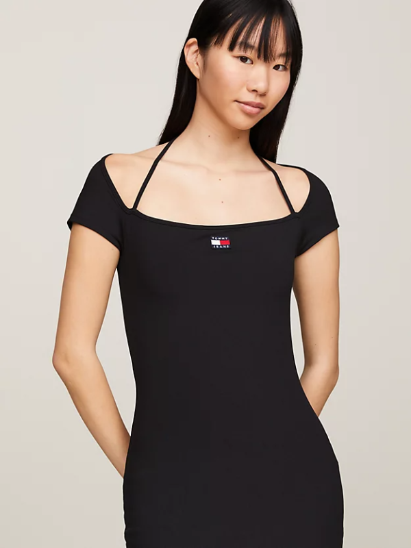 Ova Tommy Hilfiger haljina temelji se na silueti, s rebrastim pletenim materijalom izrezanim na pripijeni, puni oblik tijela i izrezanim dekolteom.