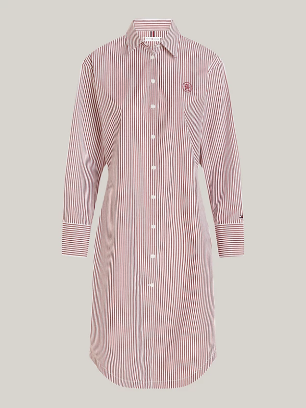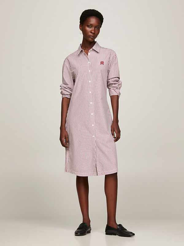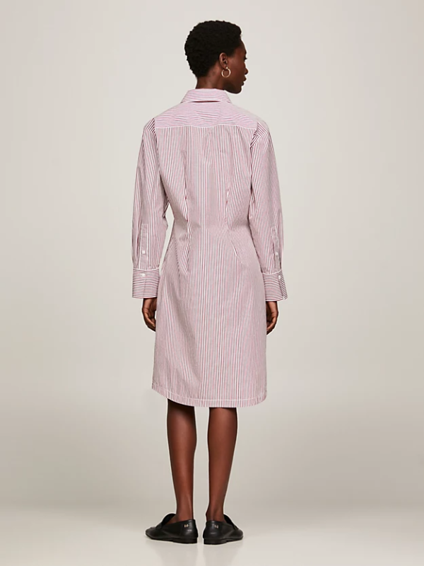 Ova opuštena košulja s okomitim prugama stegnuta je u struku za ženstven, laskav oblik.