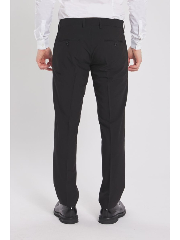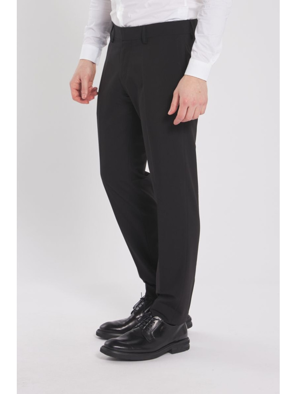 Odjevni predmet pristaje uzak i ima dizajn središnje pruge, kose džepove i preklop sa skrivenim patentnim zatvaračem i kukom. Udobne zahvaljujući sastavu tkanine od jednobojne viskoze i rastezljive vune, hlače su upotpunjene džepovima s rubom na leđima s vidljivim gumbom s četiri rupe i džepom za sat.